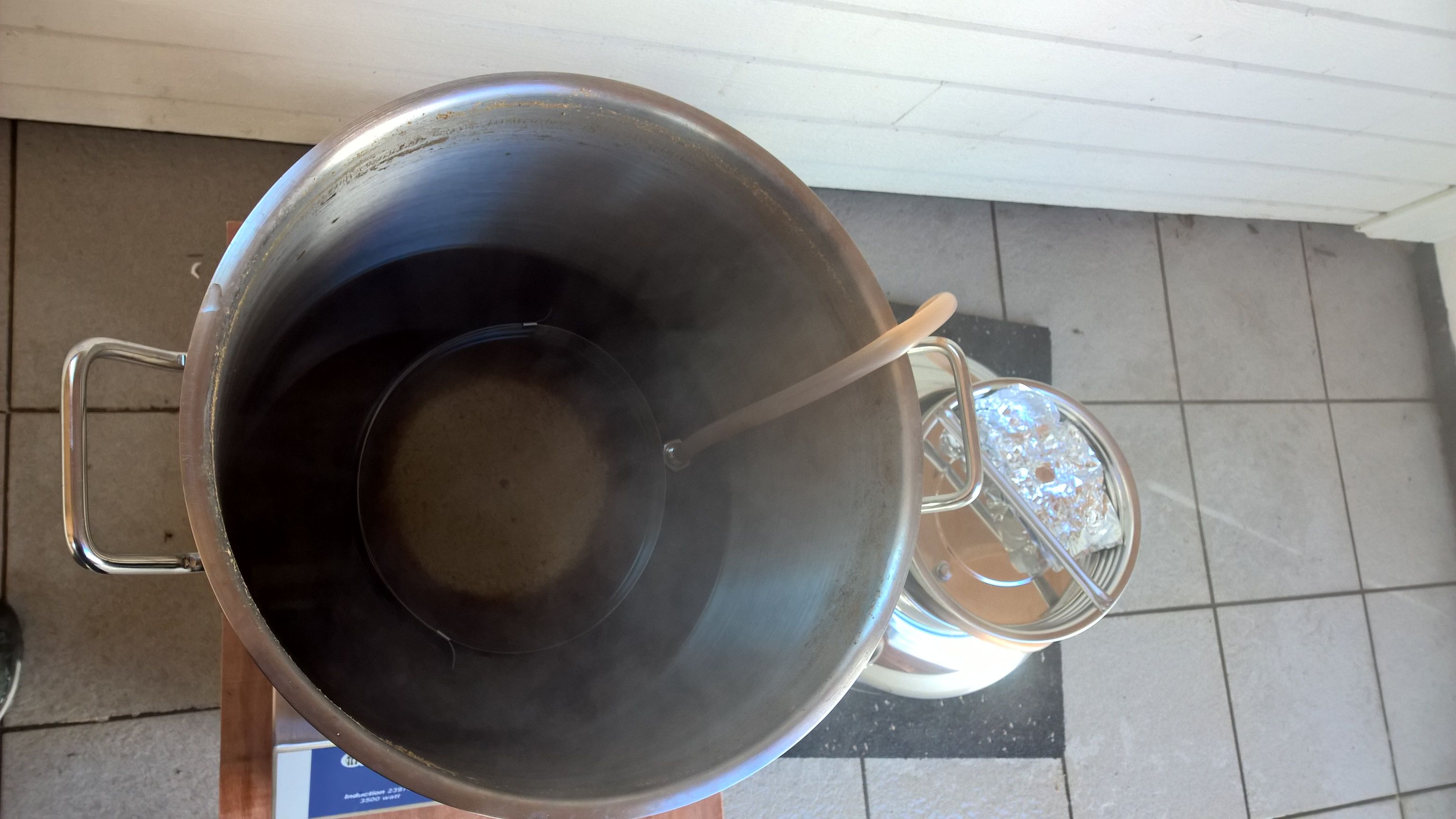 Vom Wacholdersud wurde der HG Anteil abgezwackt, der Rest ist für den NG. Bei 73°C eingemaischt. Der 25L TP ist bis zum Anschlag voll, aber das muss noch rein. Gelandet bin ich bei 66°C