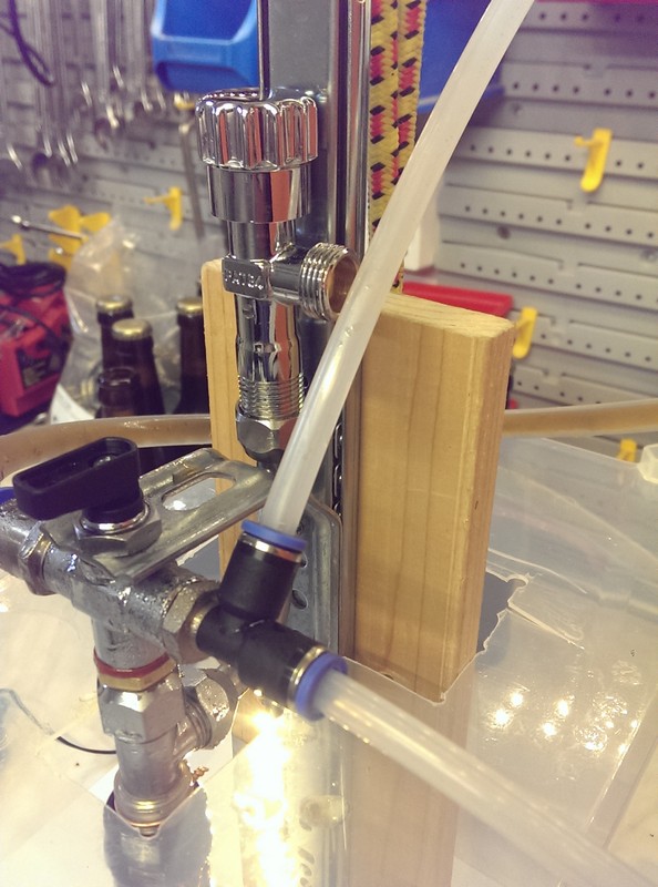 Auf das innere Cu-Rohr kommt dann ein gebogener Schluach, der das Bier am Flaschenrand herunter laufen lässt. Da muss ich noch optimieren.