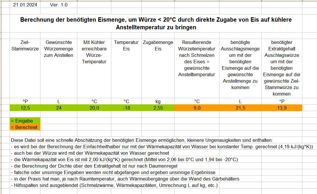 habe ich eine kleine Excel-Tabelle zum Berechnen der benötigten Eismenge, des nötigen erhöhten Extraktgehaltes und der benötigten niedrigeren Menge der Ausschlagswürze erstellt.