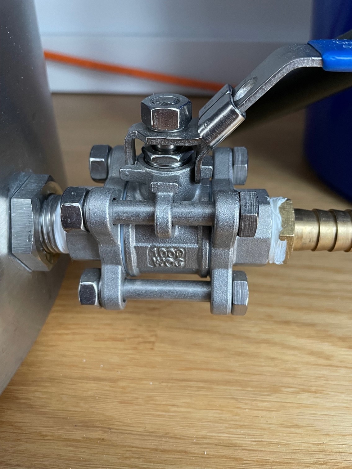 Ganz links die Mutter hat auf der Innenseite, also im inneren des Topfs, einen O Ring. Das Gewinde zw. Topf und Hahn sowie zw. Hahn und Rillenstutzen habe ich mit Teflonband abgedichtet.