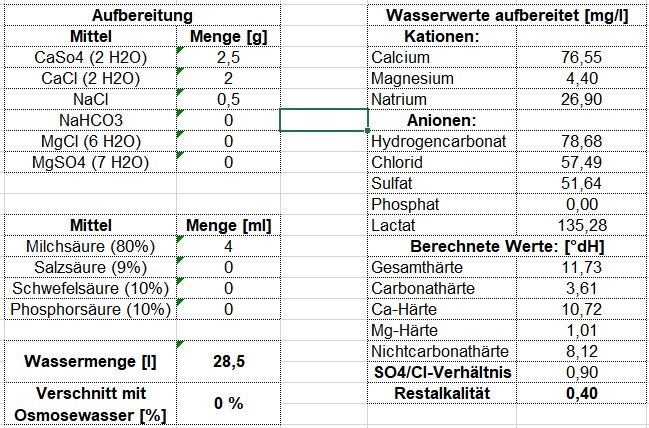 Zum Brauwasser kann ich nicht allzu viel sagen. Wir haben hier einigermaßen weiches Wasser mit relativ geringem Sulfat- und Chloridgehalt. Normalerweise salzen wir es etwas auf (die Wassermenge in der Tabelle bereiten wir doppelt in zwei Glühweinkesseln auf). So passt es auf jeden Fall recht gut.