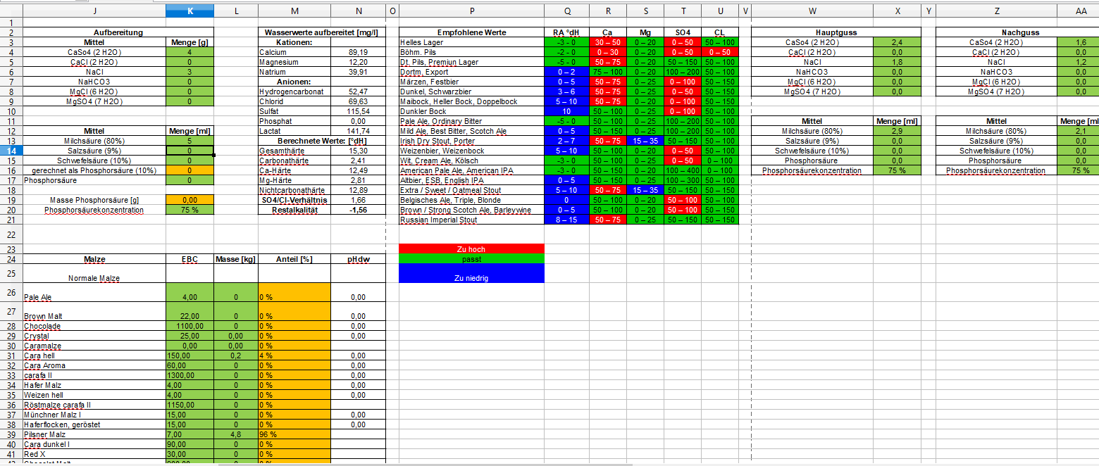 Ich habe mein Brauwasser (Haupt- und Nachguss) mit Milchsäure (80%) aufbereitet. Dazu hatte ich den Rechner von MMuM bemüht mit folgenden Daten: