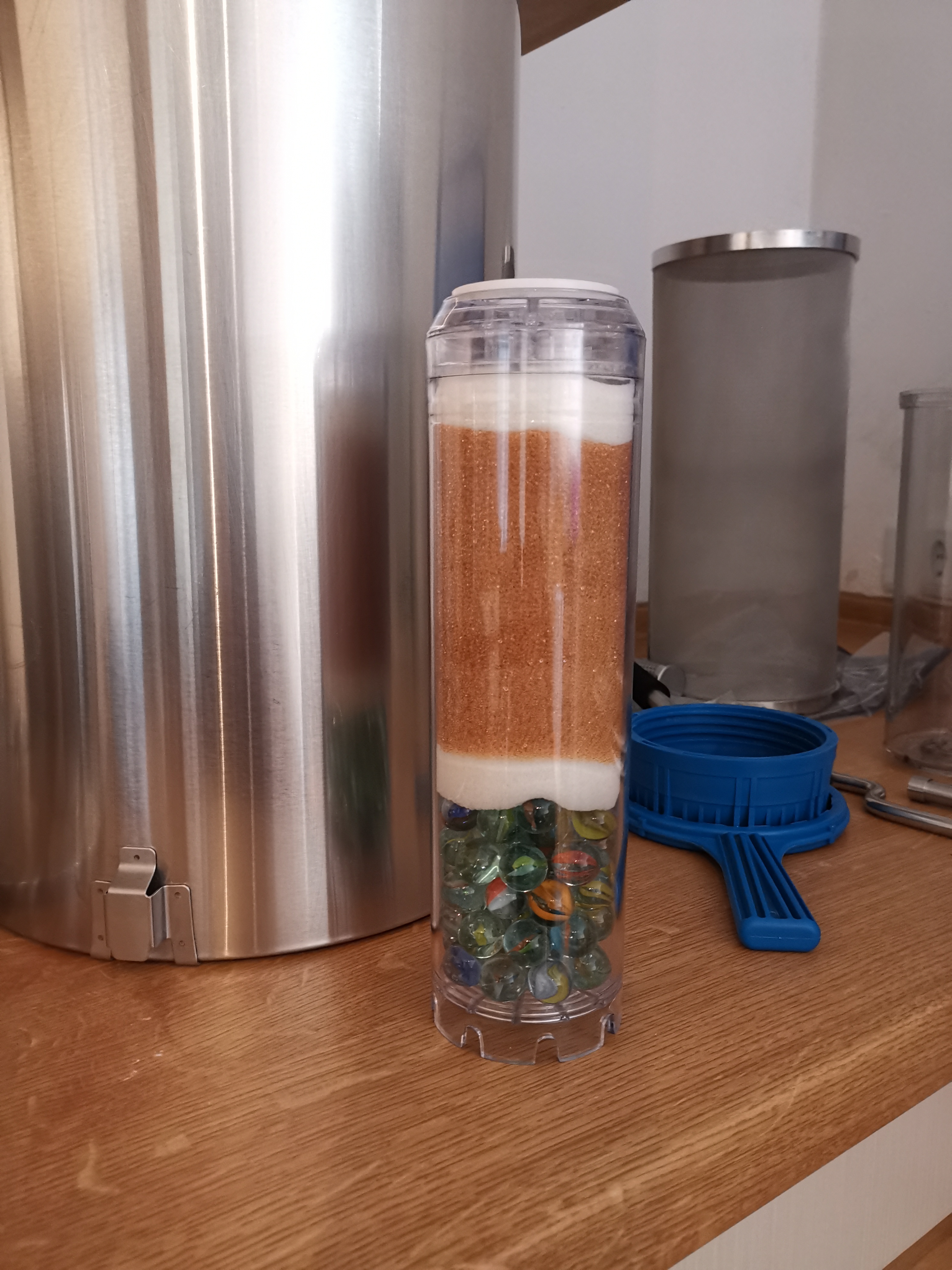 Ich habe jetzt vor 30 L mit der 2,5x10 Zoll Kartusche nur zu erzeugen (da ich mit weiteren 30-35 L MUC-Wasser verschneide), folglich sollte noch Kapazität da sein für ei paar Sude. Werde die Enden mit Küchenfolie verschließen und in Kühli geben für 1 Woche, dann wird wieder gebraut (oder zumindest Kaffeewasser gezapft). Ein, zweimal werde ich dann in der Brausaison nochmal eine neue Packung aufreißen, thats the Plan.