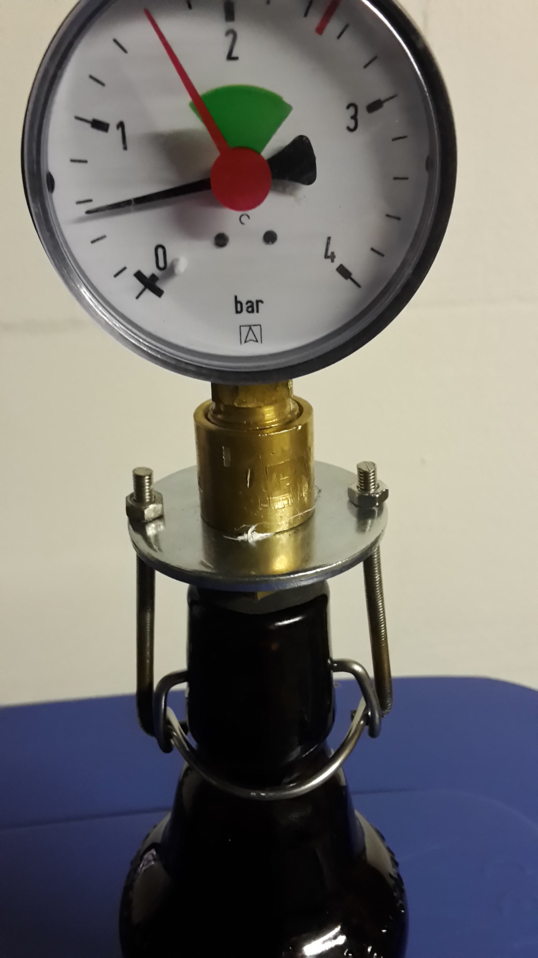 So denne ein bischen gebohrt ( Löcher in die U-Scheibe), ein bischen gebogen ( Gewindestange) und alles mit dem Bügelverschluß an die Flasche montiert. Und es funzte sofort ( Pulle wurde mit Mineralwasser gefüllt und geschüttelt ). Der Druck hält seit 3 Stunden.