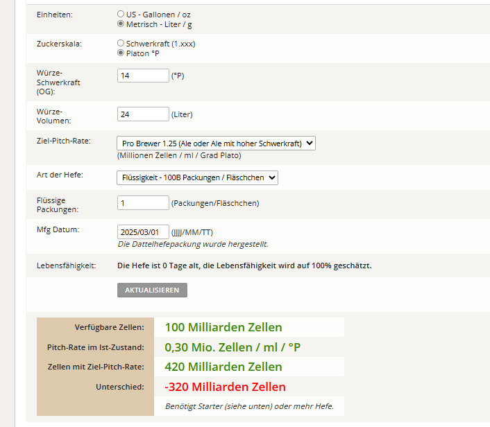 Anstellmenge: °P x L = Mrd Zellen. => 14°P x 24 Liter = ~336 Mrd Zellen.