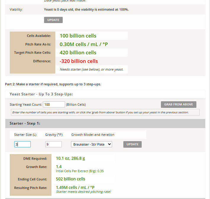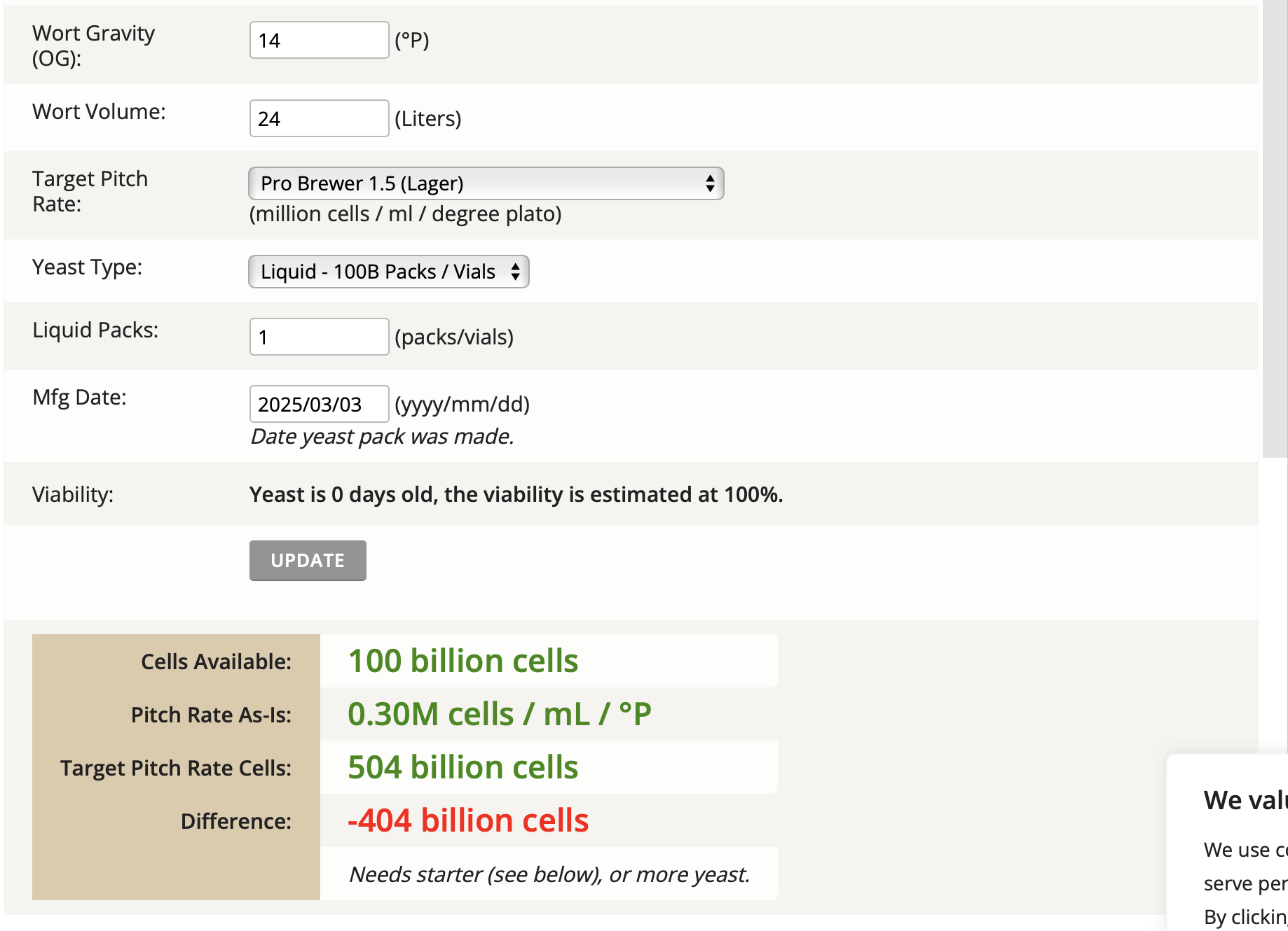 Bei mir sage ich, dass etwa 0,1 Mrd. / ml Hefezellen sich im Starter nach 24h ansammeln können. Wenn du im Brewersfriend 1l Starter eingibst bei 6°P sagt er etwa 180 Mrd Zellen. Das wären also dann 0,18 anstatt 0,1. Mit 0,1 bist du auf jeden Fall auf der sichereren Seite, denn besser mehr als zu wenig Hefe :-)