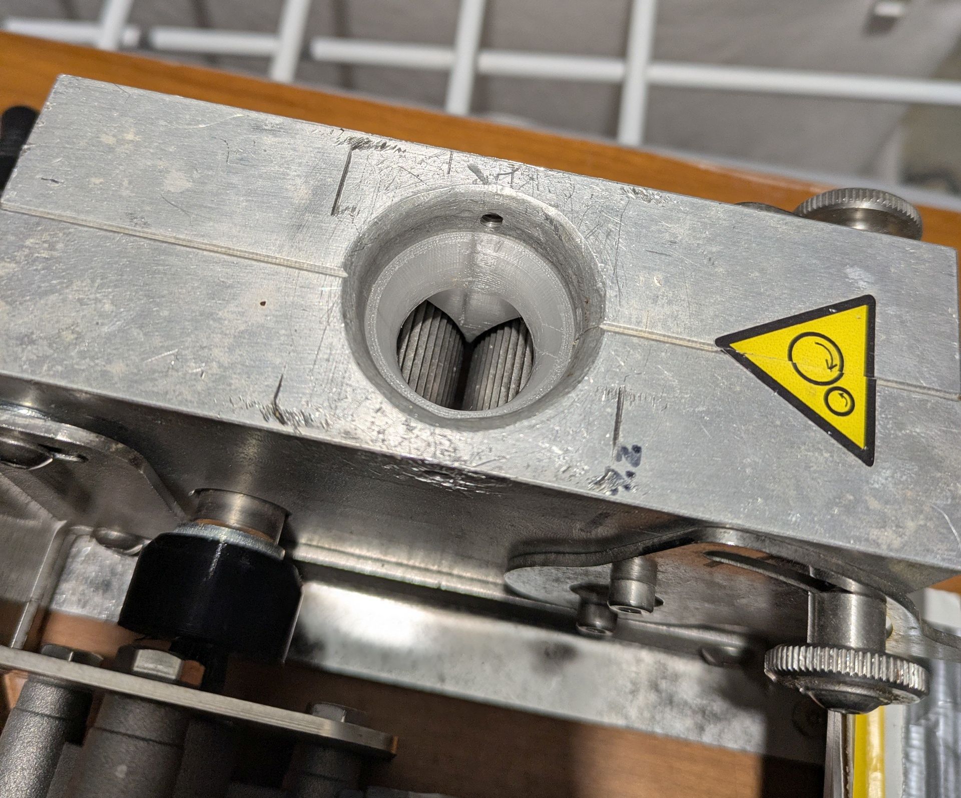 Mit diesem Druckteil werden die Körner von diesen beiden Bereichen ferngehalten, sie können nur mehr zwischen den Walzen gequetscht durch. Funktioniert sehr gut und es finden sich praktisch keine ungebrochenen Körner mehr.