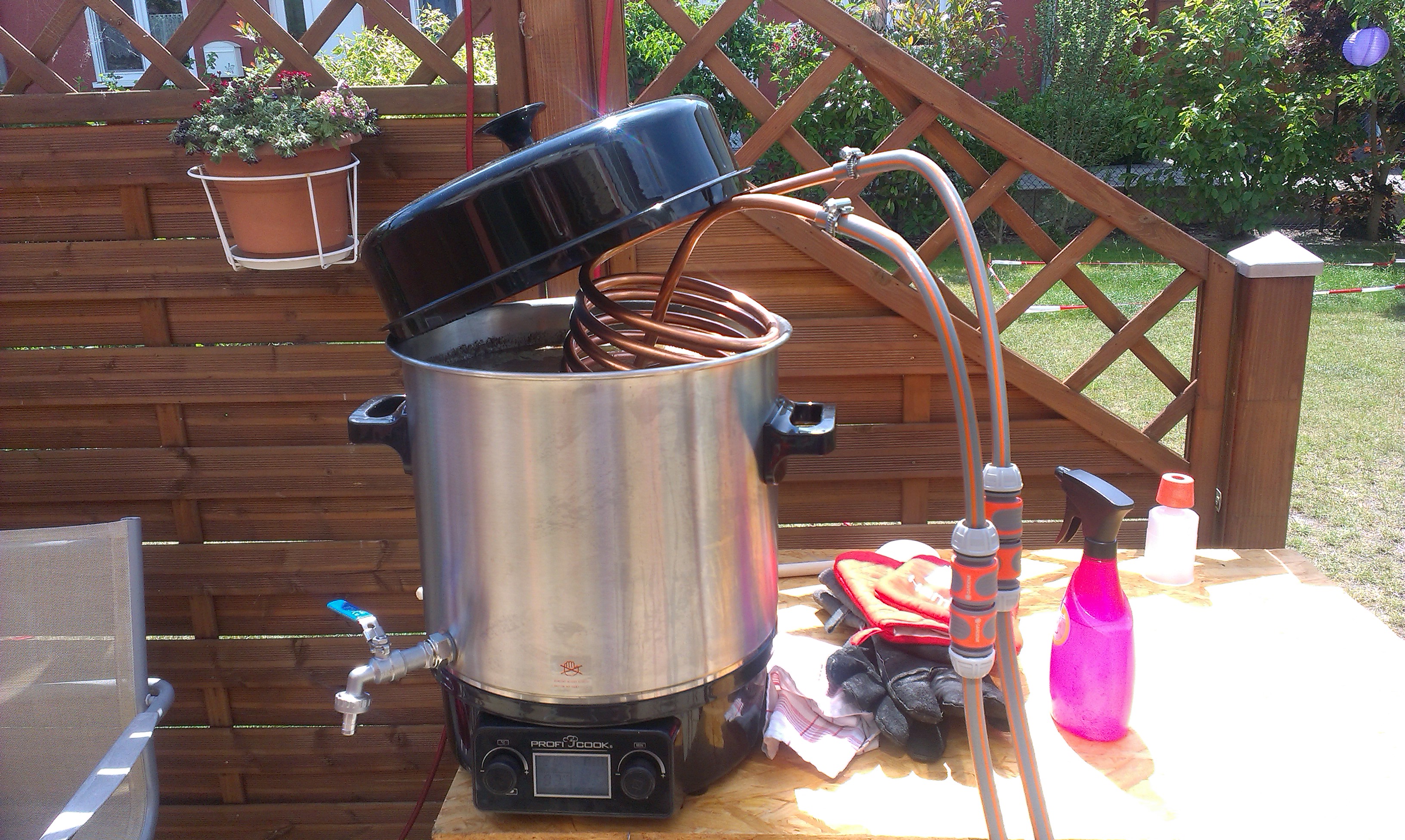 Ich starte in der Einkocherklasse mit dem Profi Cook und einer Läuterhexe. Die Brauzeit war von 09.00 bis 15.00 Uhr auf der Terasse bei lauschigen 30°C.