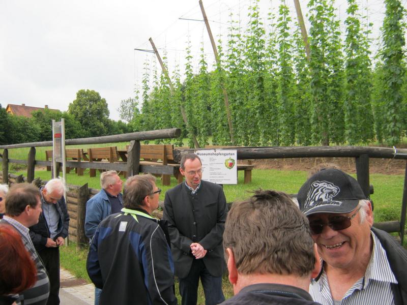 Vor dem Spalter Museumshopfengarten. Der gut gelaunte Spalter Braumeister, Herr Schulz (der Herr vor dem Schild), der sich selbst als Hophead bezeichnet, erzählt uns was über die Hopfenphilosophie der Stadtbrauerei: "Man verwende nur Aromahopfen, keine Bittersorten. Aromasorten auch nur Spalter Spalt und Spalter Select. Das Spalter Helle habe 33 IBU, was Andernorts nicht mal im Pils zu finden sei". Recht so, das gefällt mir und betätigt, was ich schon immer vermutet habe. Spalter Select im Pils Nr, 1.