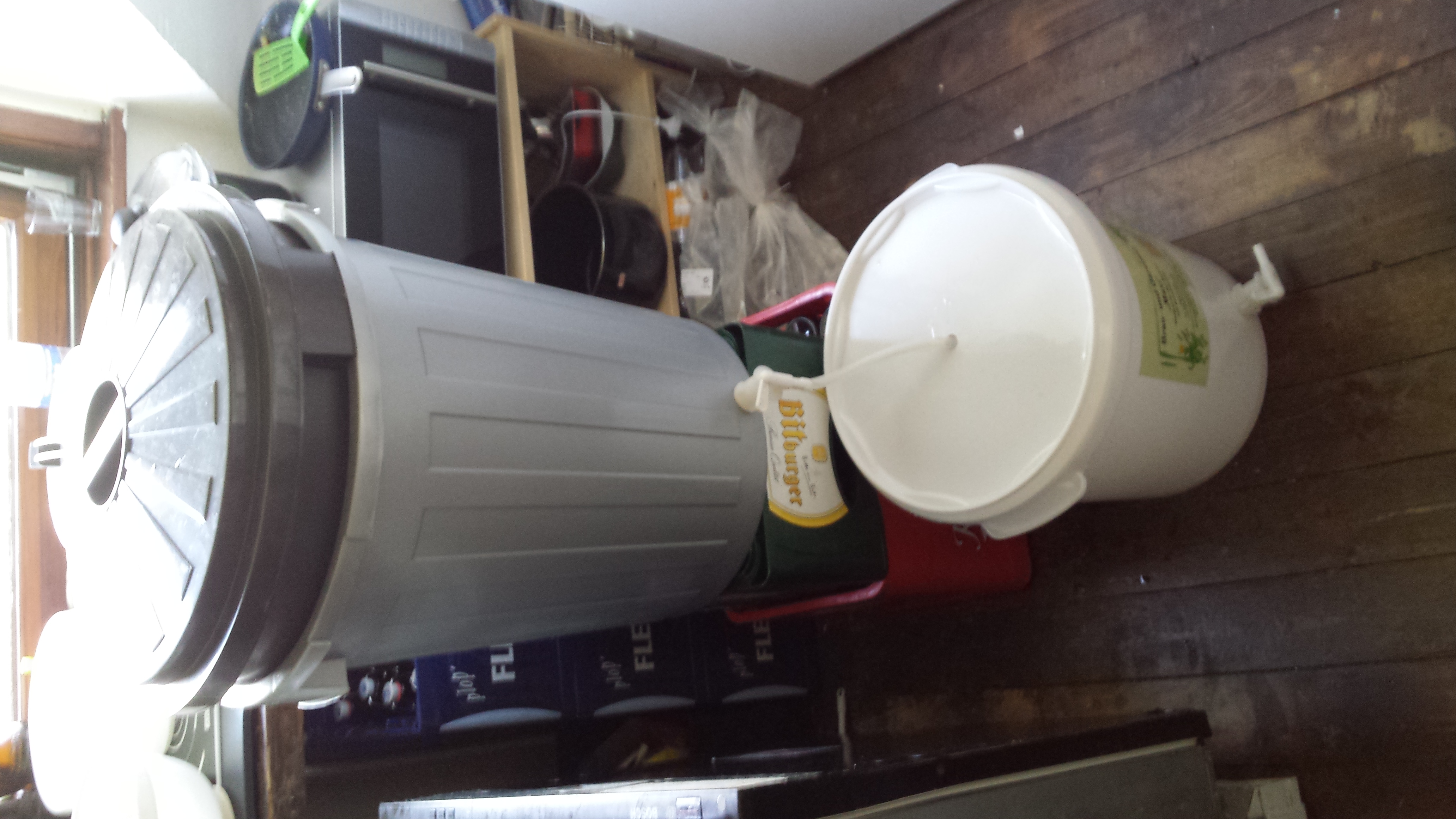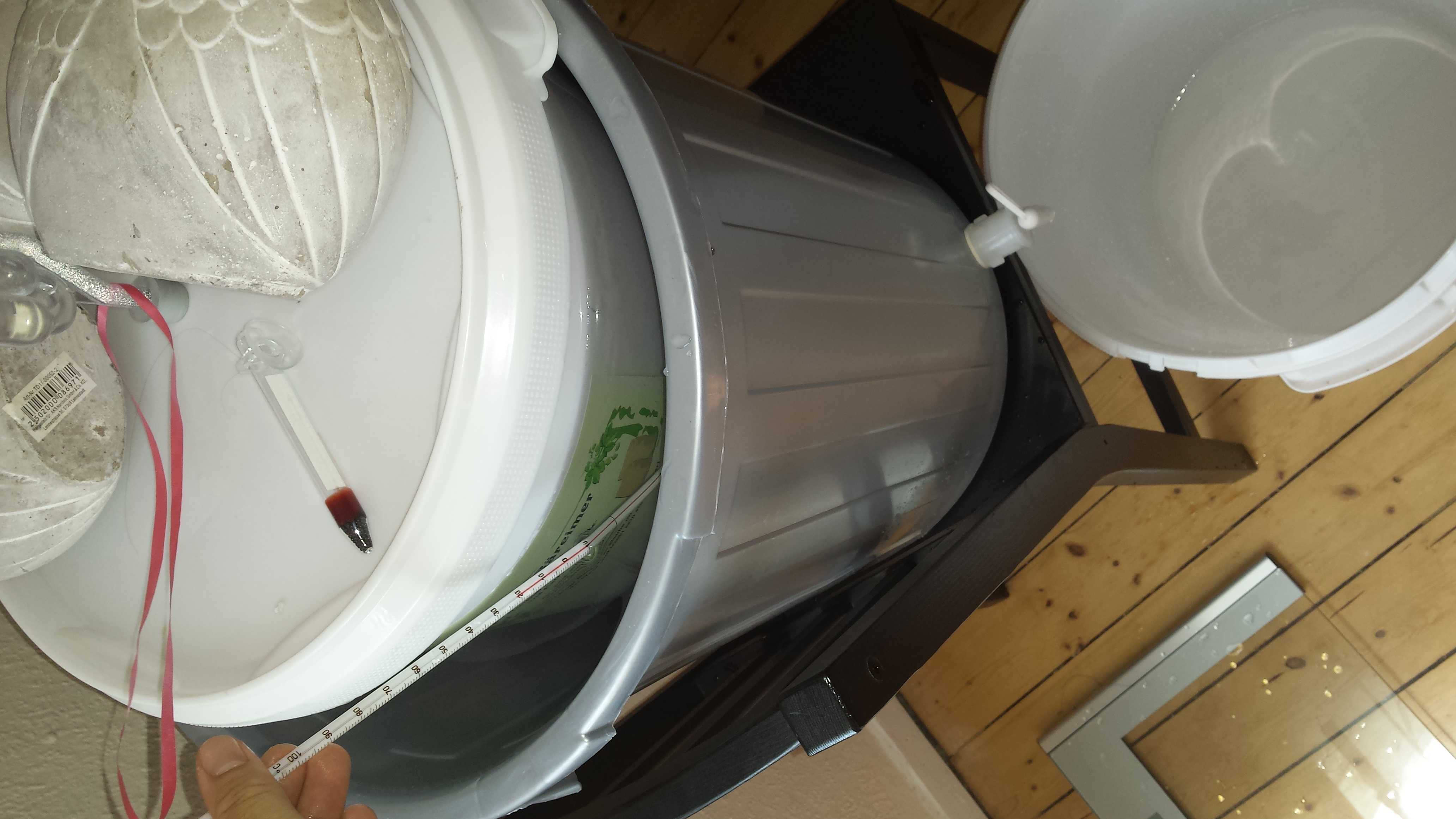 Da die Hitze in meiner Wohung die Überhand zu übernehmen scheint, wurde kurzerhand der Gärbehälter bis auf weiteres im mit Wasser gefüllten Läuterbottich kaltgestellt. Ich war bisher zu faul den Gäreimer in den Keller zu tragen, da ich im Dachgeschoss wohne. Geworden sind es 21,5 L bei 12.5 Grad Plato.