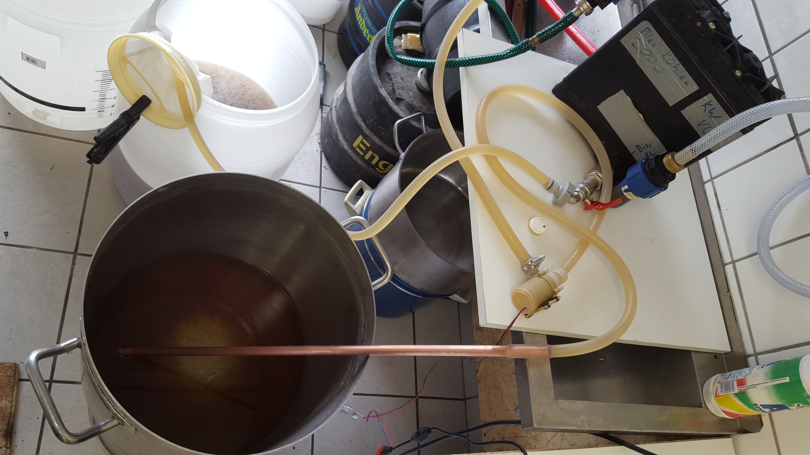 *)An meiner Kühlspirale habe ich 3 # Abstandshalter monitiert. Die Kühlspirale dämpfe ich vor dem Einsetzen in meinem Wasserkessel/Glühweinkocher (welchen ich zuvor zum Erhitzen des Nachgusswassers verwende)