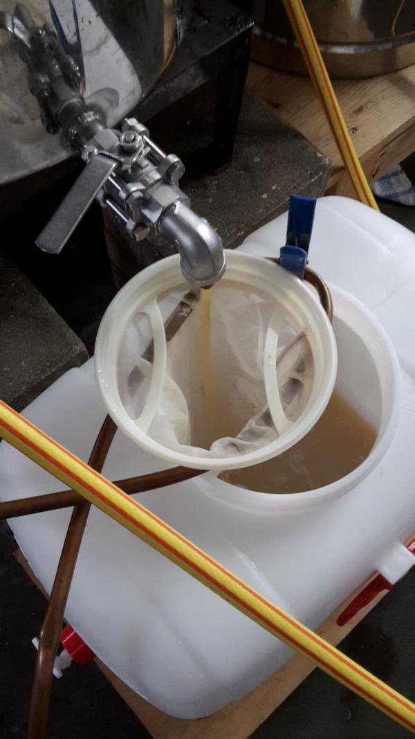 7) Ablassen der Würze am Hahn in das Gärfass, filtriert durch einen Plastiktrichter mit integriertem Feinsieb