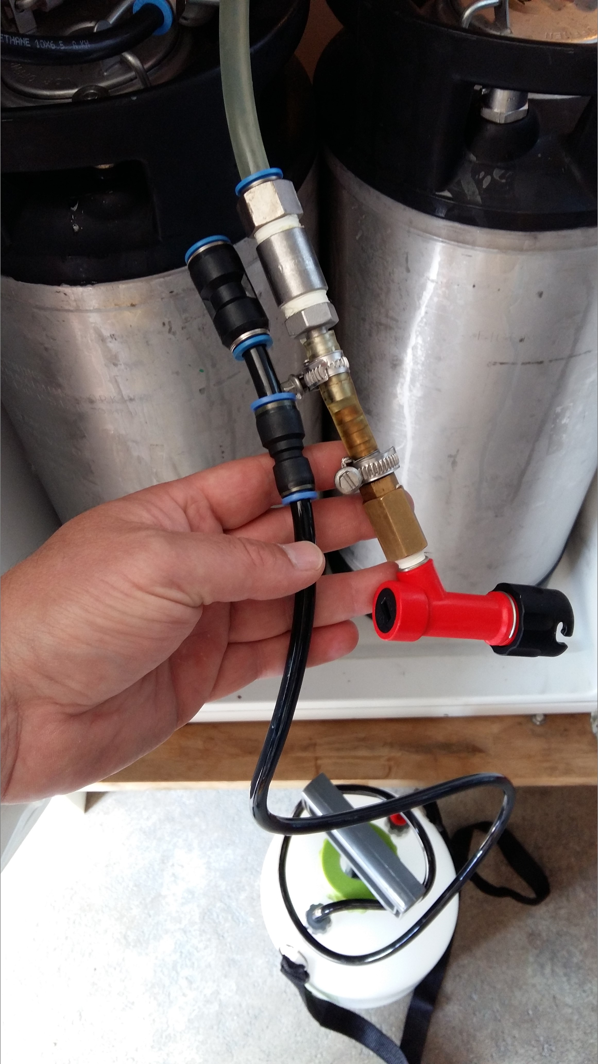 Da ich an meiner Zapfanlage keinen Wasseranschluss habe, habe ich mir aus Festo Steckverbindern einen Adapter gebaut.