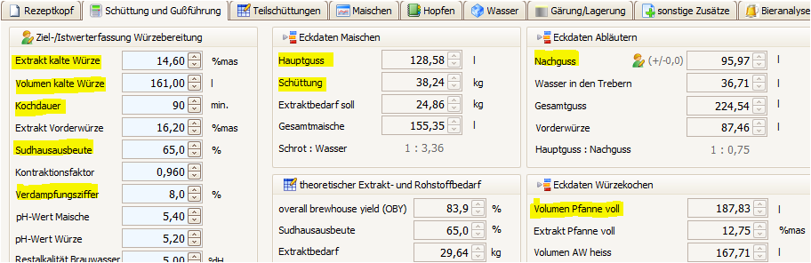 Zielstammwürze, Ausbeute, VZ(8%), Kochdauer(z.B. 90 min) . Das Verhältnis HG:NG im Rezeptoriginal lag bei 1: 0,74. Daraus lassen sich die Mengen HG und NG für die neuen Rezepturen ableiten. Die Konzentration der VW nebst der Menge ergibt sich ebenfalls daraus.