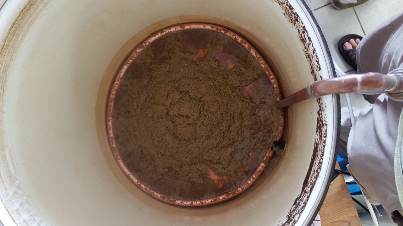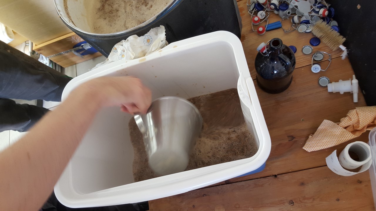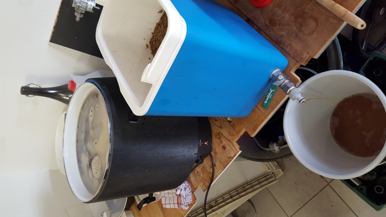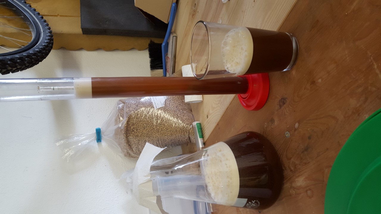 Eingemaischt bei 69°C und dann gemütlich das Rührwerk eine Stunde lang seine Arbeit bei der Kombirast machen lassen... Nach erreichen der 78°C abschöpfen in den Läuterbottich und langsam abläutern lassen... Läutern verlief entspannt und zügig, danach 30min Kochen und dann die erste Hopfengabe Wallendes Kochen Nach 90 Minuten Whirlpool und mit der Pumpe abziehen, leider hatte die Bohrmaschine einen schlag weg. Die kannte nur noch ein Gas.... Vollgas. Daraus resultierend, konnte ich nicht wie sonst langsam abziehen und direkt mit Anstelltemperatur ins Gärfass pumpen. Mussten dann noch aus dem Gärfass über den WT im Kreis pumpen bis Anstelltemperatur erreicht war. Dem Trubkegel ging es dann auch ein wenig zu schnell. Wenigstens war dann die Würze gut belüftet und der Hefe ging es auch gleich richtig gut. Hier mal ein Probierschluck, Grundlage für die S04 und der Zylinder für die parallele Dauerbespindelung. Alles schön aufgeräumt und bereit für das nächste mal: Stammwürze waren 13,5°P und heute blubberts schon wie sau. Im zylinder ists schon auf 7°P runter.