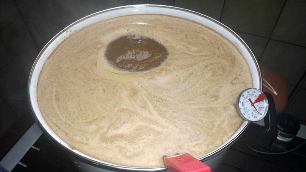 Mit Tauchsieder und Einkocher aufgekocht, als mir die Brühe entgegen kommen wollte, Einkocher aus, der TS heizt jetzt alleine.