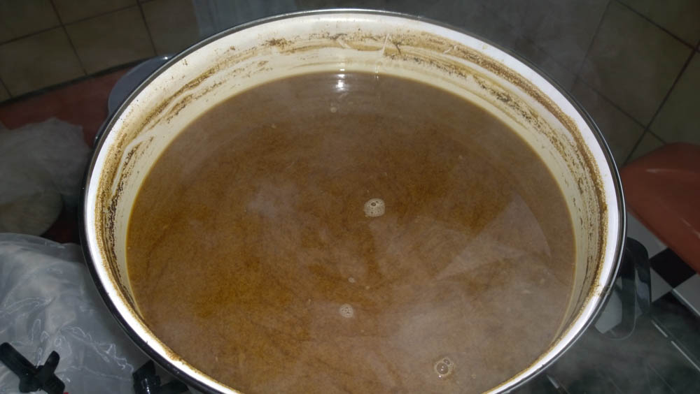 Dann Gardine raus, in den 8-Liter-Nachgußtopf und den Rest der Würze in den Einkocher.