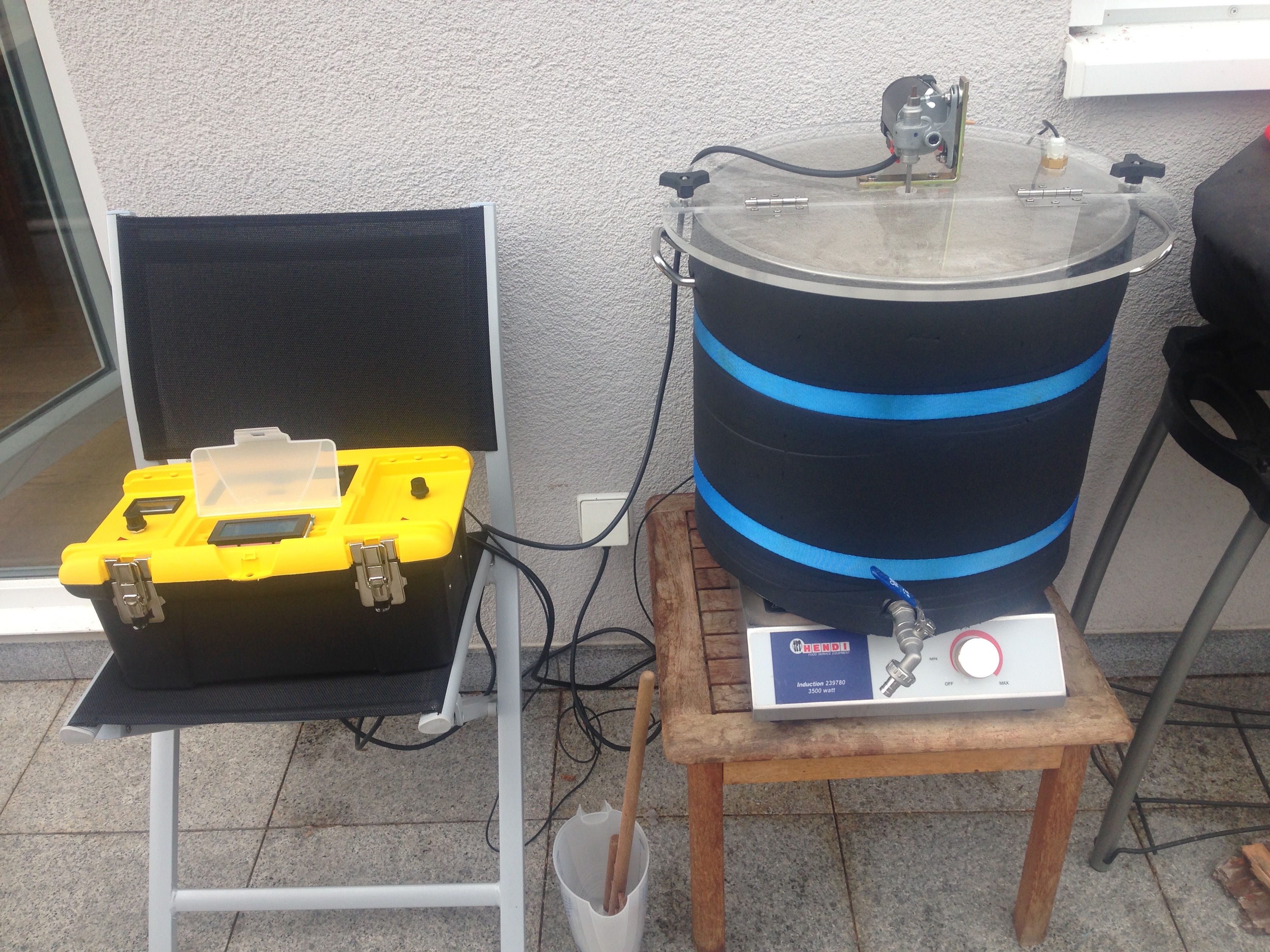 Die Steuerung ist eine auf fg100's basierende Arduino-Steuerung mit 20x4 I2C-Display und für das Rührwerk benutze ich ein Auto-Batterie-Ladegerät als Stromversorgung und eine Geschwindigkeitsregulierung von Conrad. Dies alles habe ich in eine kleine Werkzeugkiste aus dem Baumarkt zusammen eingebaut.