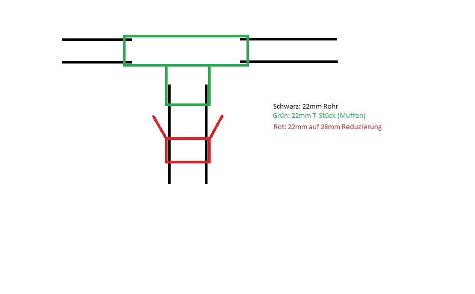 - Reduzierung, welches in ein 15mm T-Stück passt und am anderen Ende ein 12mm Rohr aufnimmt