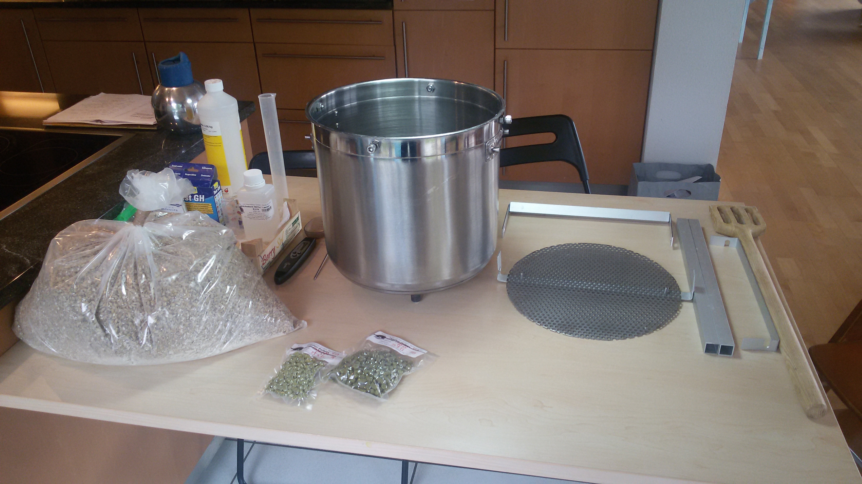 - 10:10 Uhr: Am Start sind meine beiden Brauhelfer Fynn und Lio, eine Kopie des Braumeister von Speidel 20Liter, diverses Zubehör und ich, welcher sich nun an seinen neunten Sud macht.