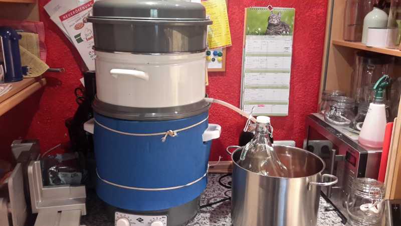 Also hurtig ein paar Kilo Äpfel vom Baum geschüttelt und in den Entsafter rein. Ein paar frühreife Quitten wollten auch mit. Heissentsaften ist nicht optimal, da der so produzierte Saft eher dünn und abgekocht schmeckt, aber für ein Experiment reichts allemal.