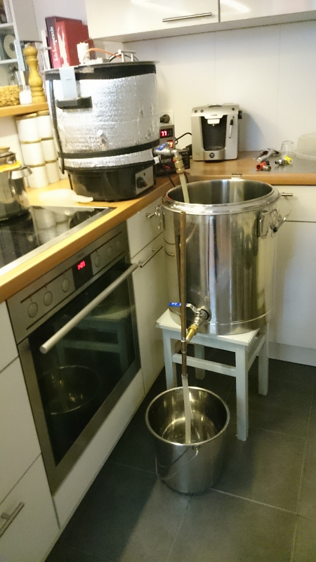 Hier schon die Vorbereitung zum Läutern. Die dicke Maische hat dann aber doch nicht durch den Hahn gepasst um musste mit einem Topf umgeschöpft werden.