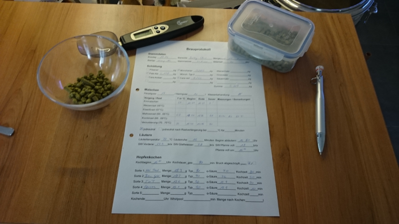 Dann entsprechende Hopfengaben nach dem Rezept, hier ist die 2. Gabe abgewogen und auf dem Brauprotokoll vermerkt. (Leider etwas unscharf)