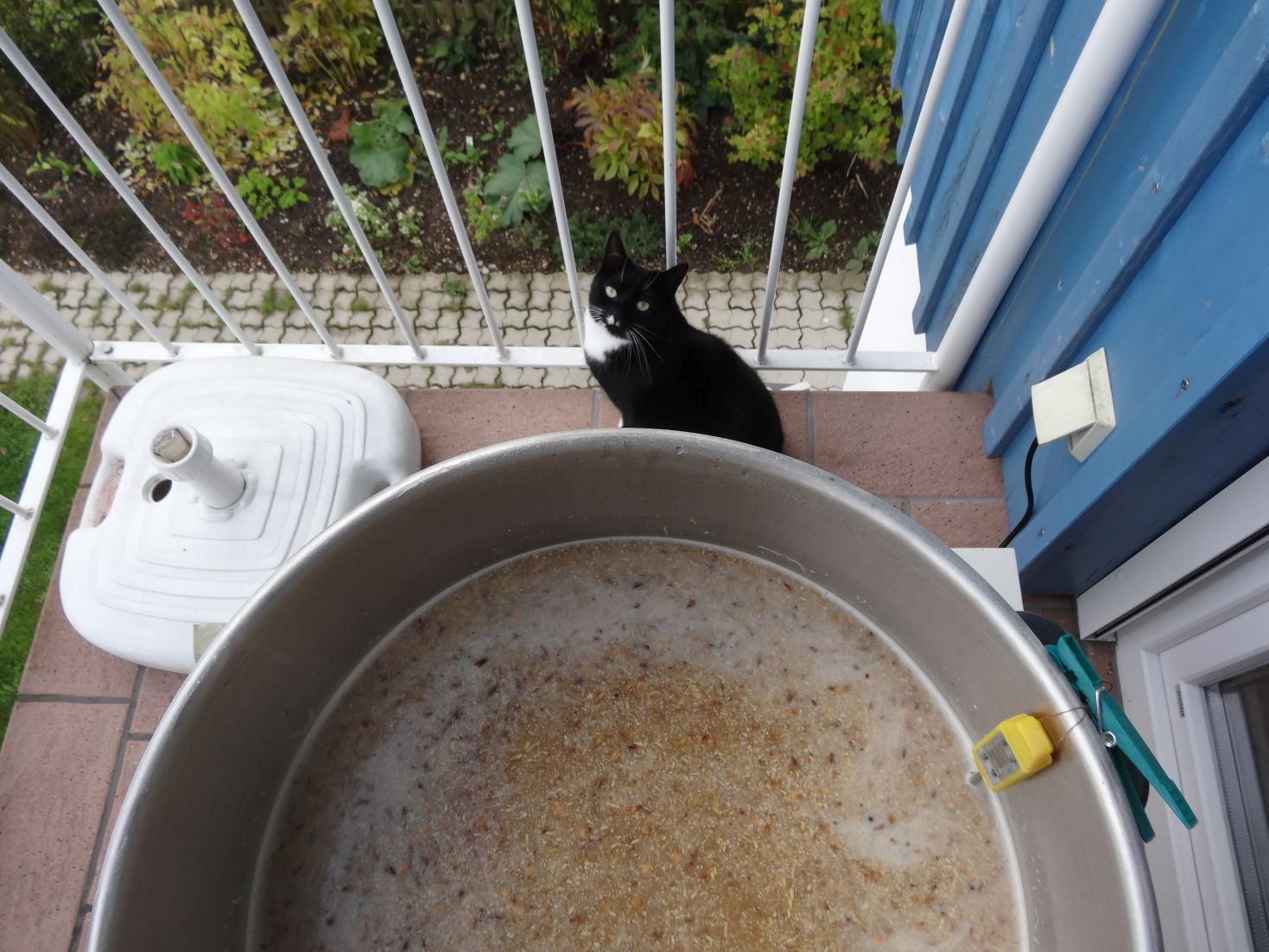 Eine unsere Katzen hat ein waches Auge auf die Maische, damit sie nicht anbrennt ;-)