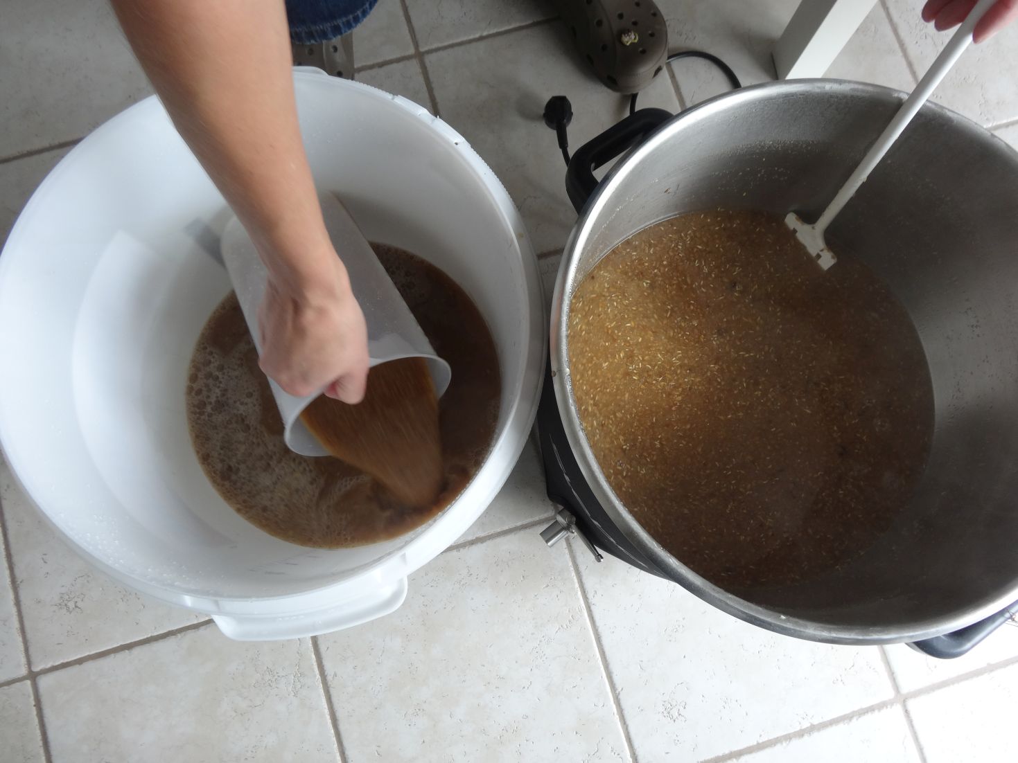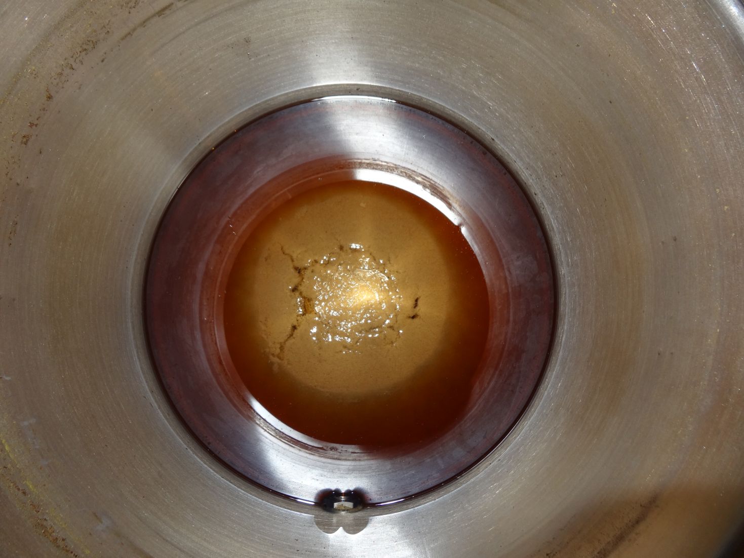 Das Läutern zieht sich, die Nachgüsse werden vorsichtig mit Messbecher und Schaumlöffel drauf gegossen... gegen Ende müssen wir dann aber doch zum ersten Mal den Treber etwas aufhacken, weil gar nichts mehr kommt und das Nachgusswasser kein Durchkommen hat. Hatten wir bislang noch nie. Aber Ende gut, alles gut.