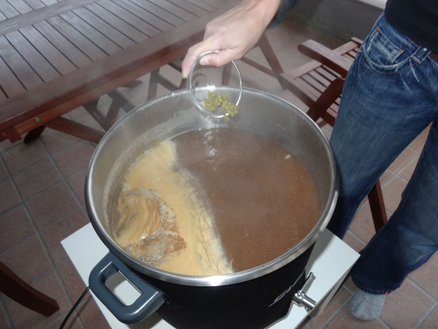 Die zweite Hopfengabe nach 10 Minuten (10 g Magnum), die nächste Hopfengabe folgt dann erst 10 Minuten vor Kochende.
