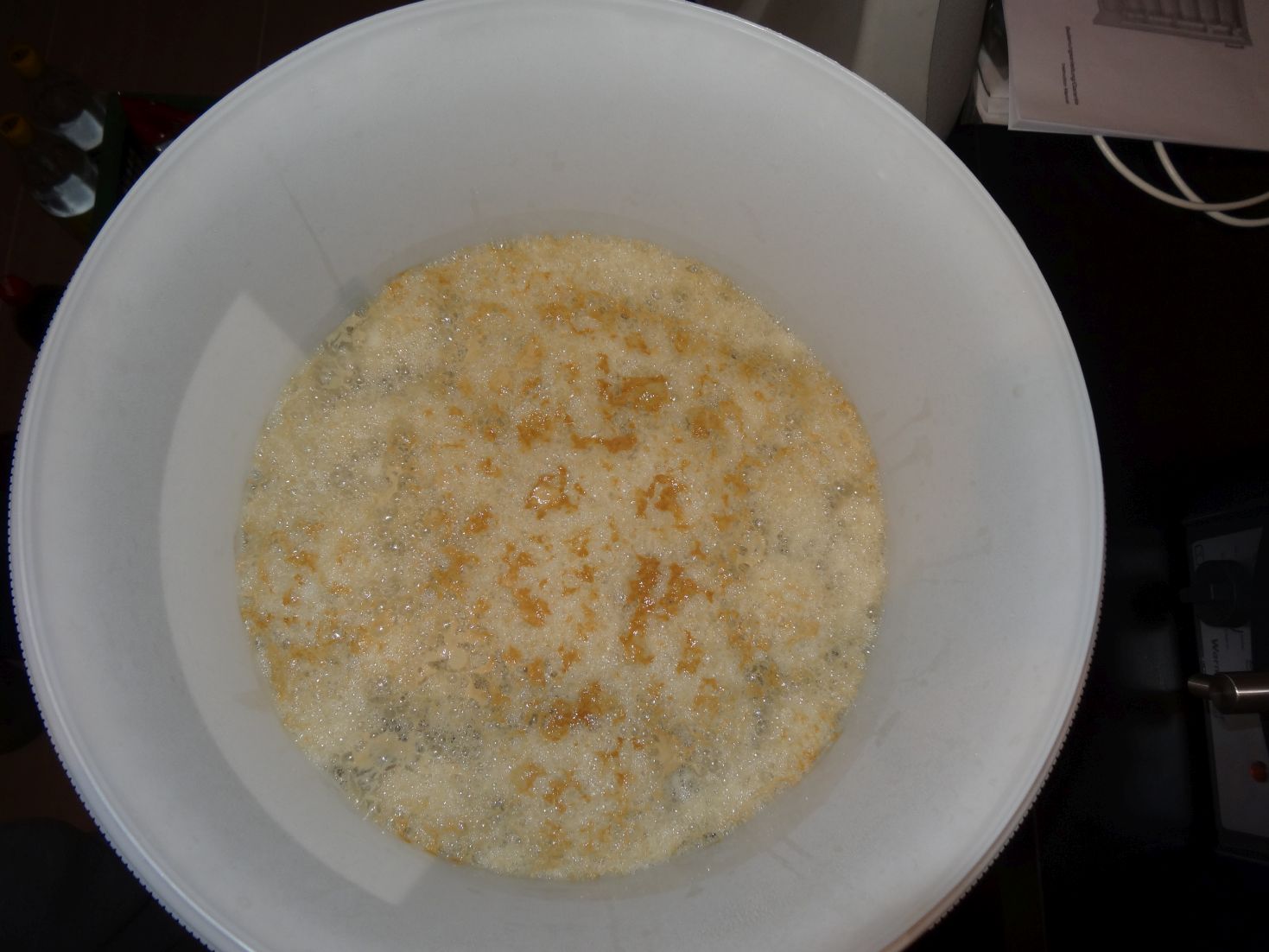 24 Stunden später: die Hefe ist schon ziemlich fleißig gewesen, das sieht super aus... und wie gut das riecht! Ich bin schon sehr gespannt.