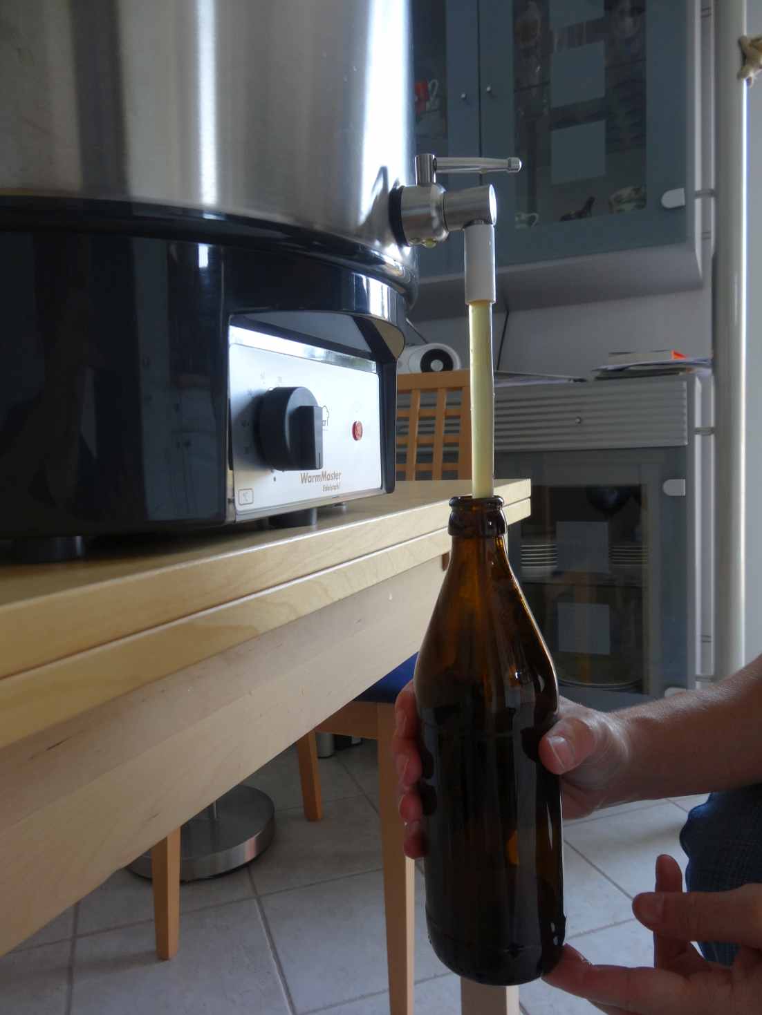 Das Foto ist entstanden, bevor wir dann noch mal oben mittels Teesieb was abgeschöpft haben. Ich würde schätzen, dass wir ca. 3/4 des Biers ohne nennenswerte Hopfenflunserl in die Flaschen gekriegt haben. Bei den restlichen Flaschen ist dann schon hin und wieder was mitgeflossen, bei den letzten 1-2 Flaschen evtl. etwas mehr. Aber dann haben wir eh einen großzügigeren Rest im Eimer gelassen. :crying