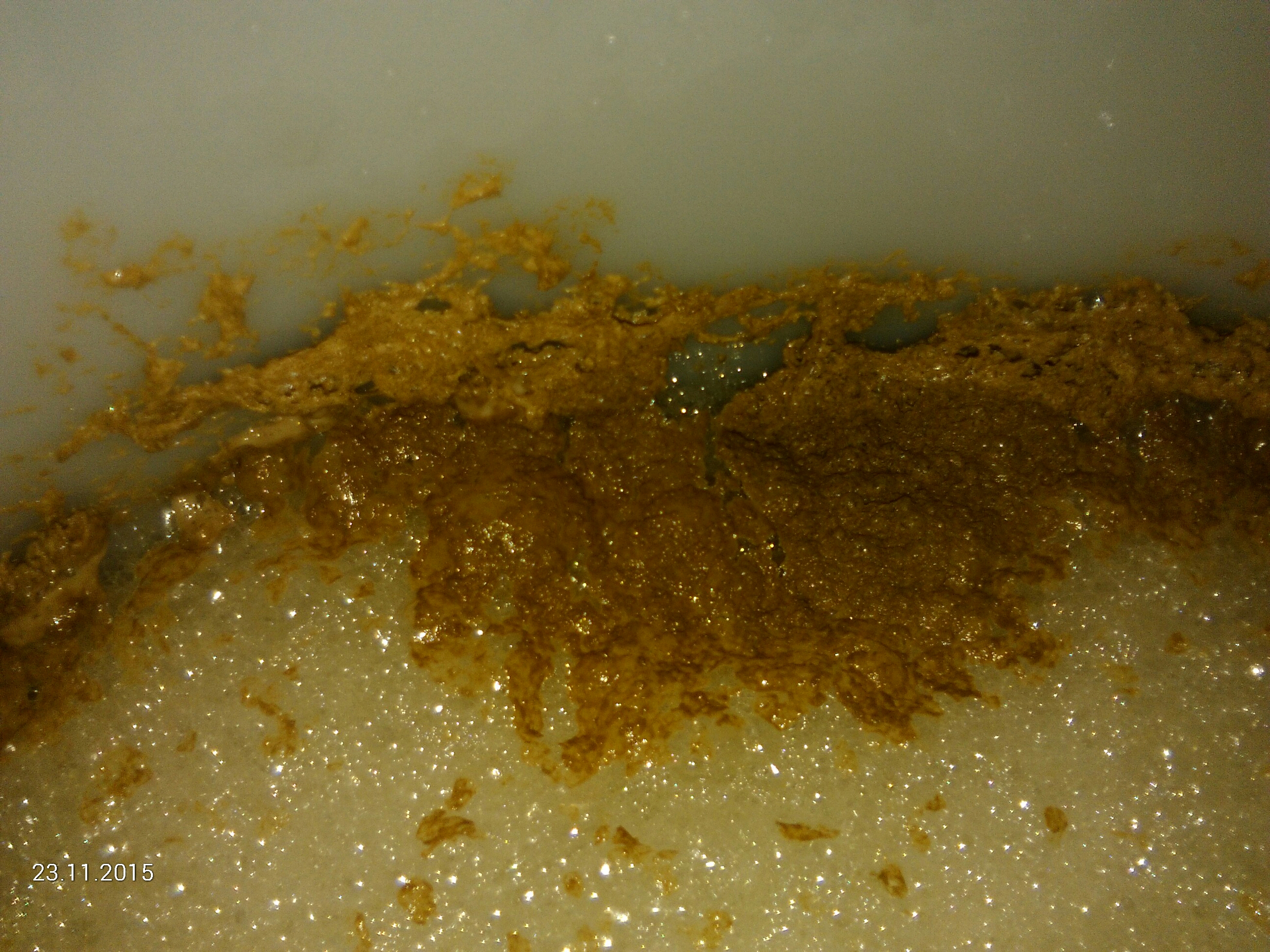 Meine aktuelle Frage: Nach 36 Stunden Gärung sieht es im Fass jetzt so aus wie auf den Fotos zu sehen. Mich wundern insb. die braunen Ausflockungen - sind das Hopfenkristalle? Sollte ich die abschöpfen?