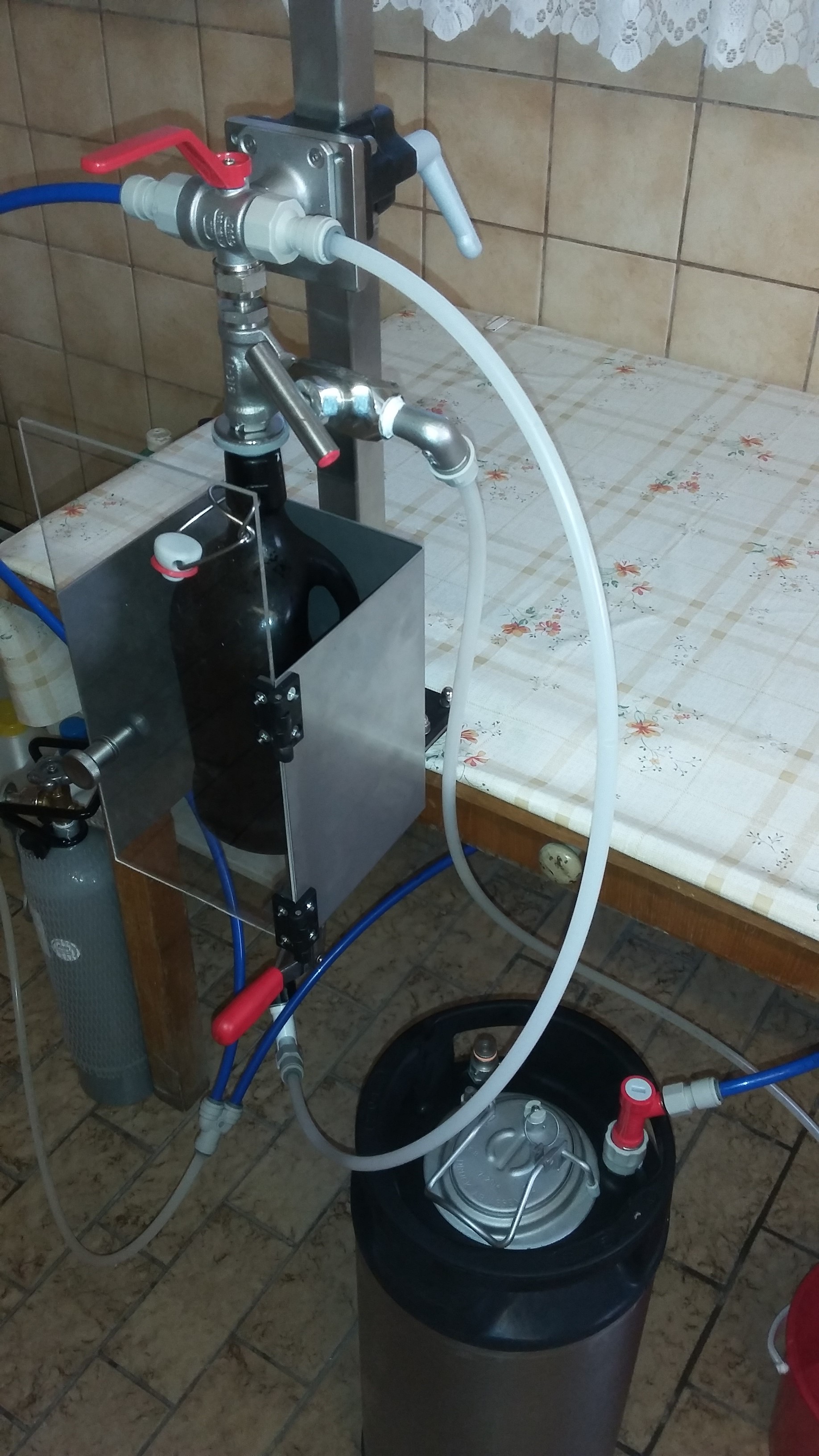 Montier ist das alles auf einem Borhmaschinenständer. Rot ist CO2-Zufuhr, durchsichtig Bier-Zufuhr.