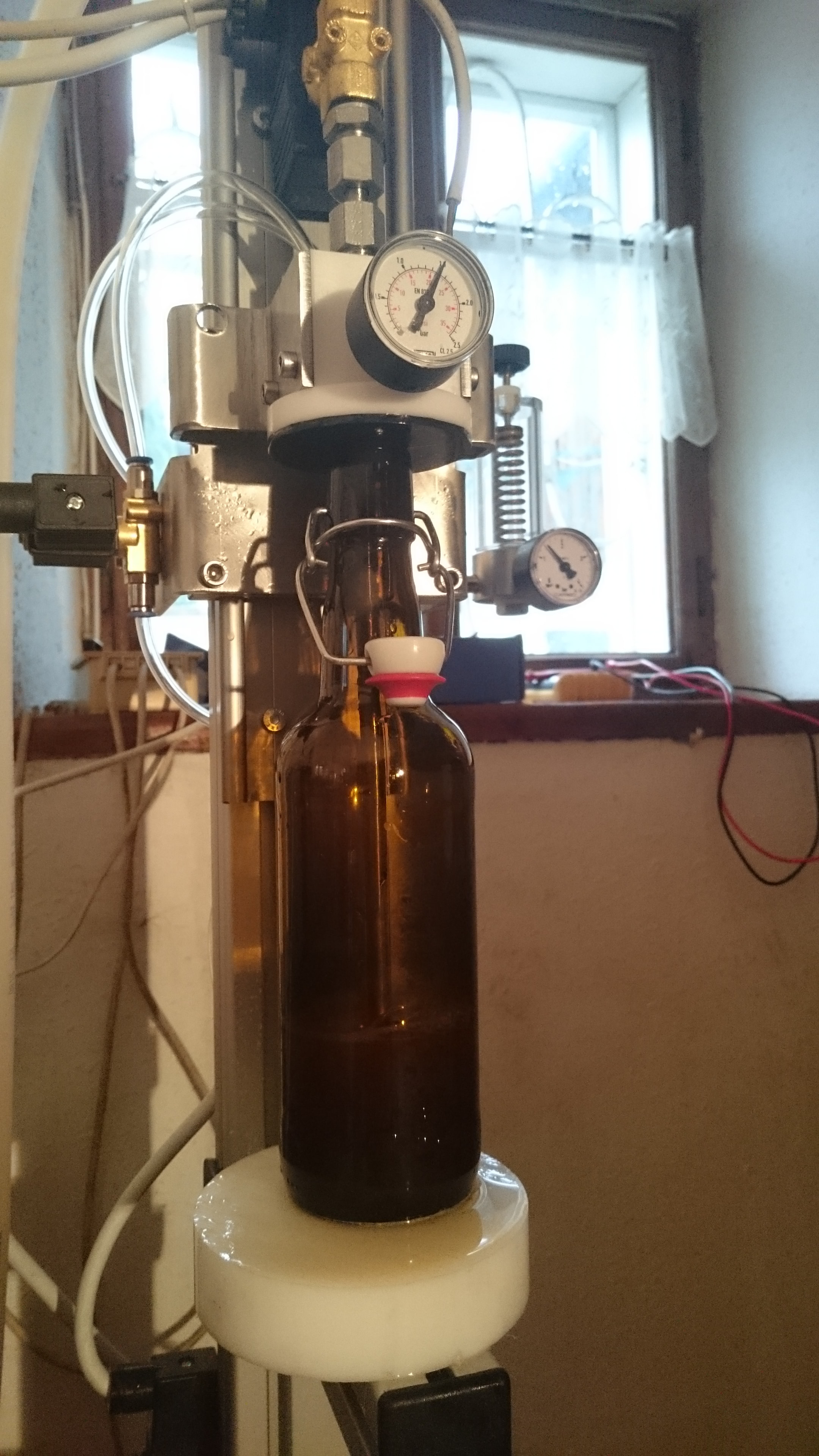 Danke für deine Antwort. Das am Ende des Abfüllens der Druck in der Falsche erhalten bleiben soll ist ein wichtiger Hinweis und spricht klar für ein Ventil vor der Abluftdrossel. Ich will wie Du die Möglichkeit haben die Flasche nach dem Abfüllen für kurze Zeit eingespannt zu lassen ohne dass es mir Schaum zurück in den Füllkopf drückt.