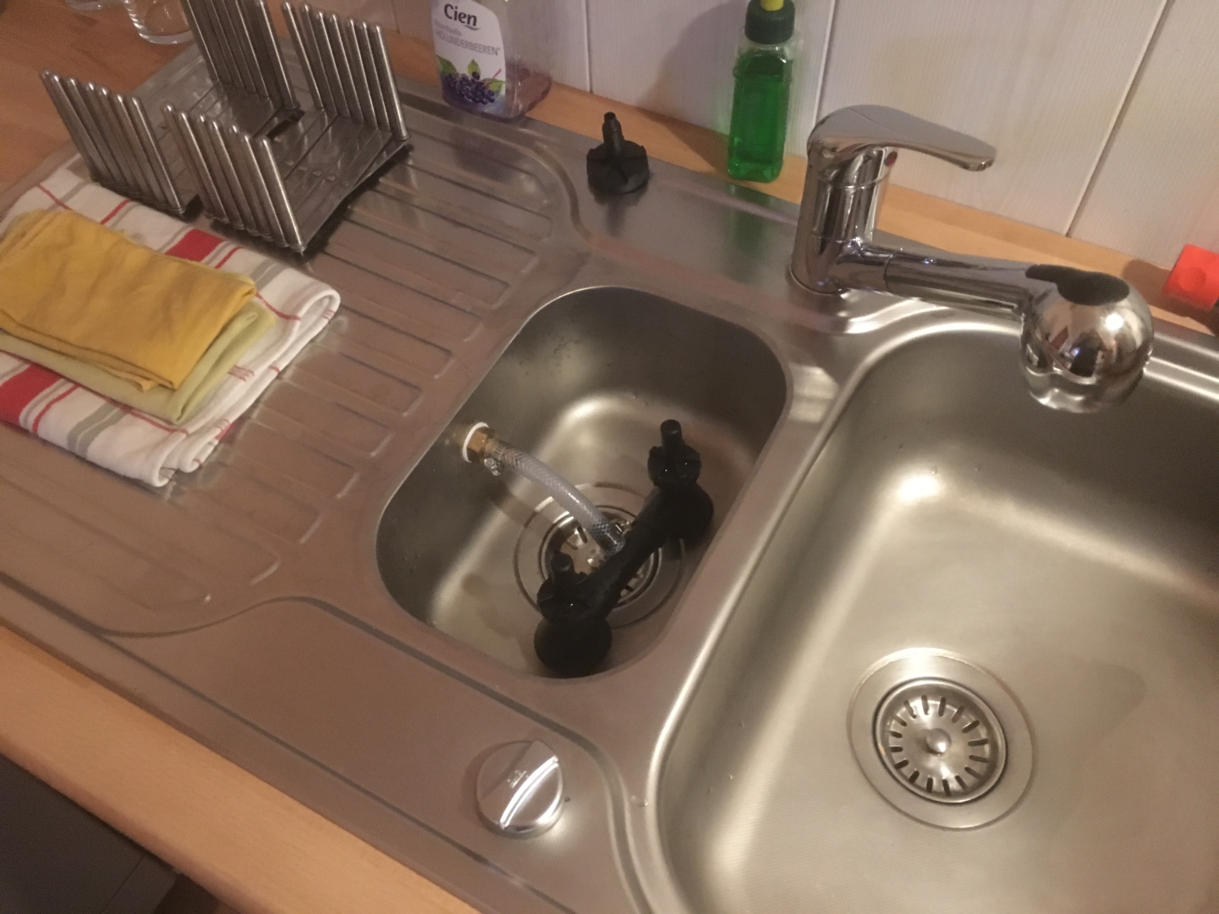 der Doppel-Spüler in der Mitte der Spüle arbeitet perfekt und kann man mit Absperrhahn unter der Spüle drucklos machen.