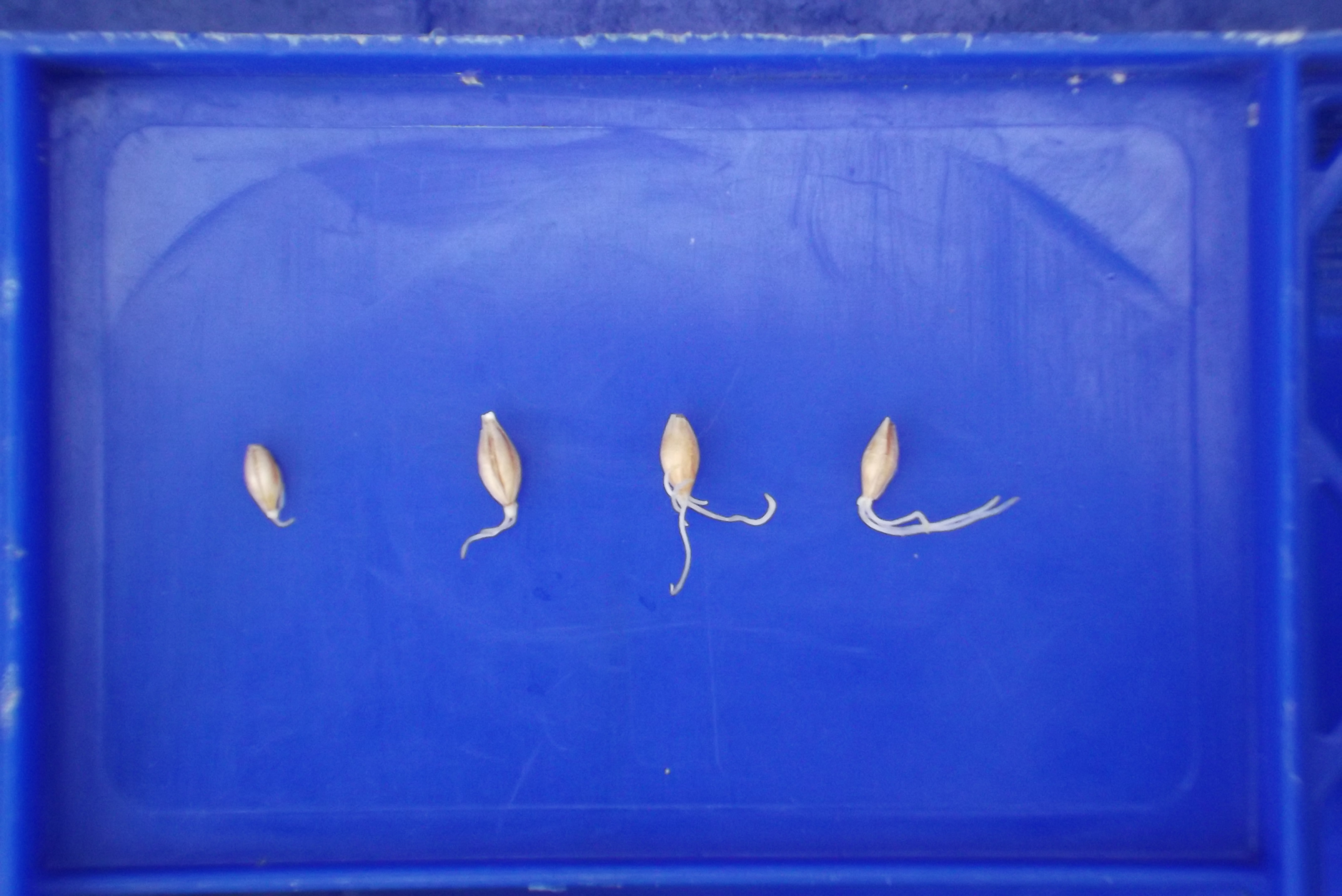 von 14 Stunden. Das war fast schon zu lang. Die Feuchtigkeit an der Kornoberfläche war gerade noch zu spüren. Die ersten Keimspitzen waren schon deutlich zu sehen.
