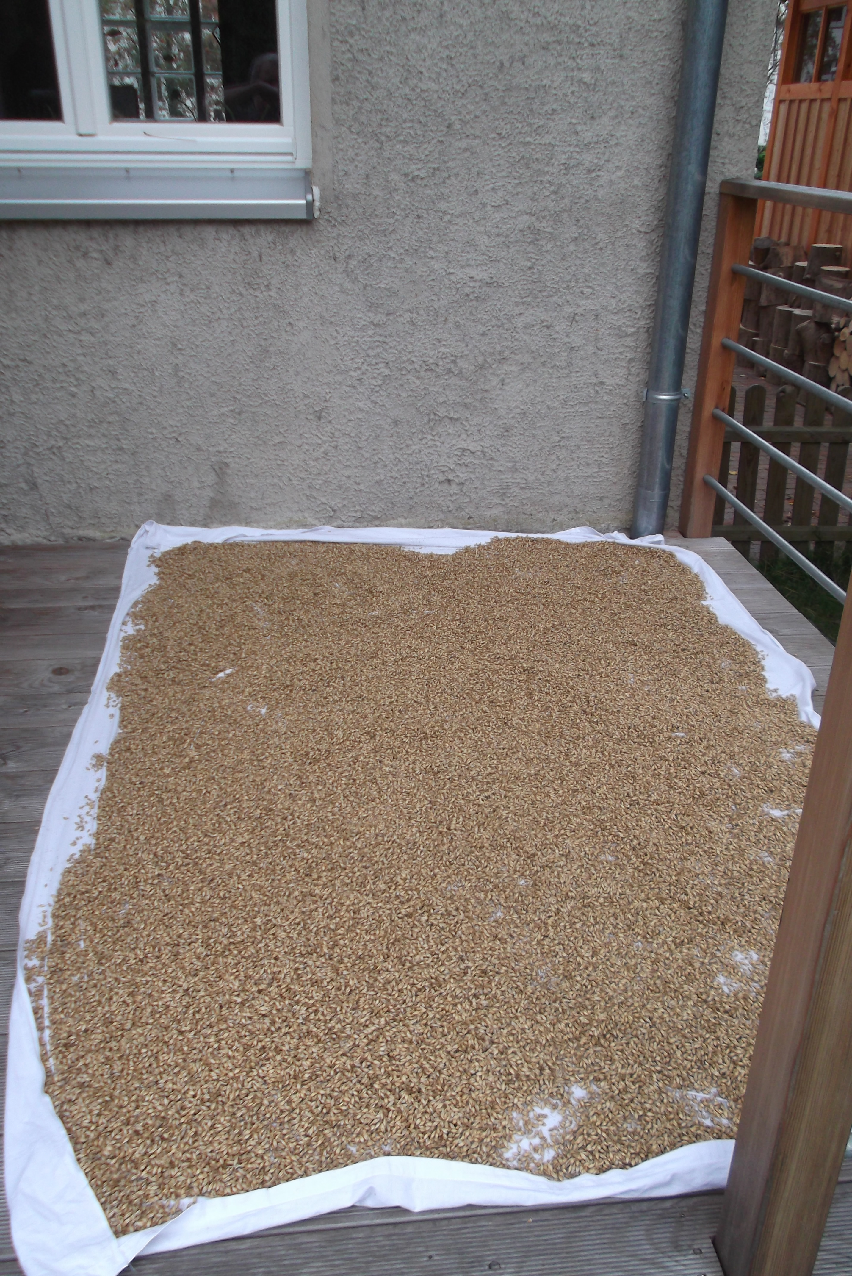 meistens draußen. Wegen Taubildung in der Nacht habe ich das Malz abends in der Veranda ausgebreitet. Oberflächlich trocken war das Malz nach ca. 2 Tagen. Nach 3 Tagen kam wieder trockeneres