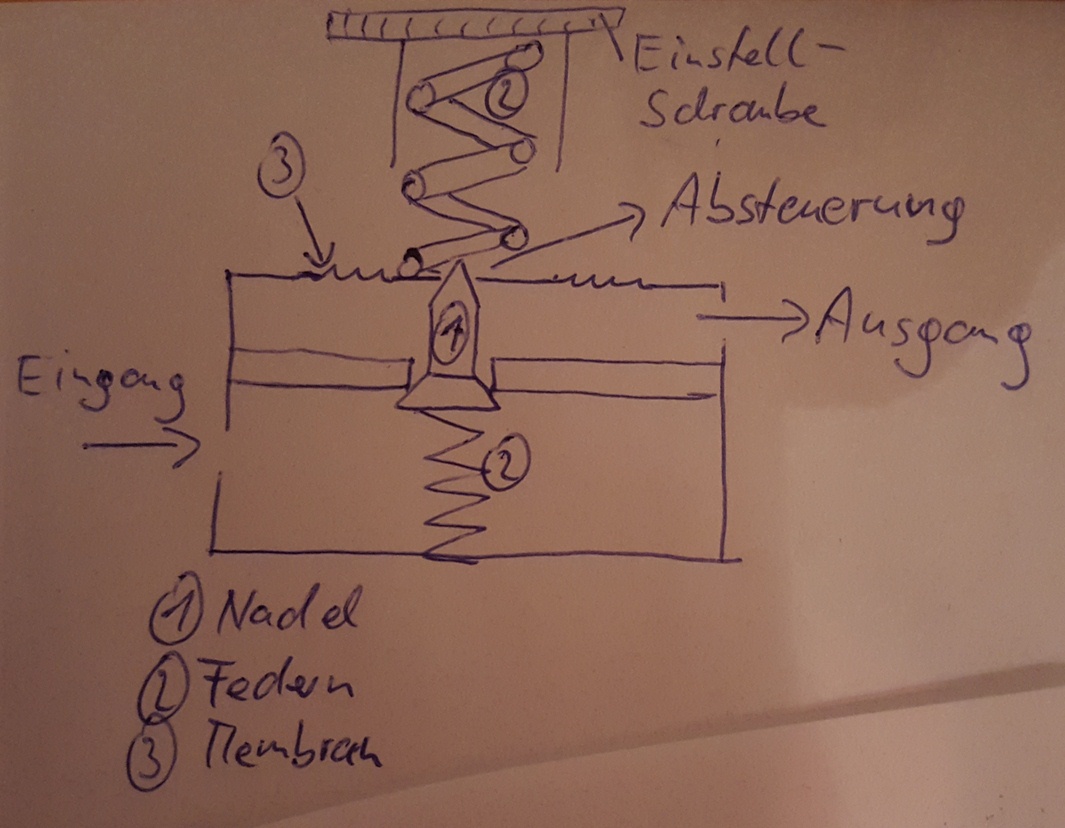 Normalerweise wird die Membran durch die große Feder nach unten gedrückt und es kann Luft vom Eingang zum Ausgang. Steigt der Druck auf der Ausgangsseite übt die Membran eine schließende Wirkung auf die Nadel aus und der Druchgang wird verschlossen (so wie gezeichnet).