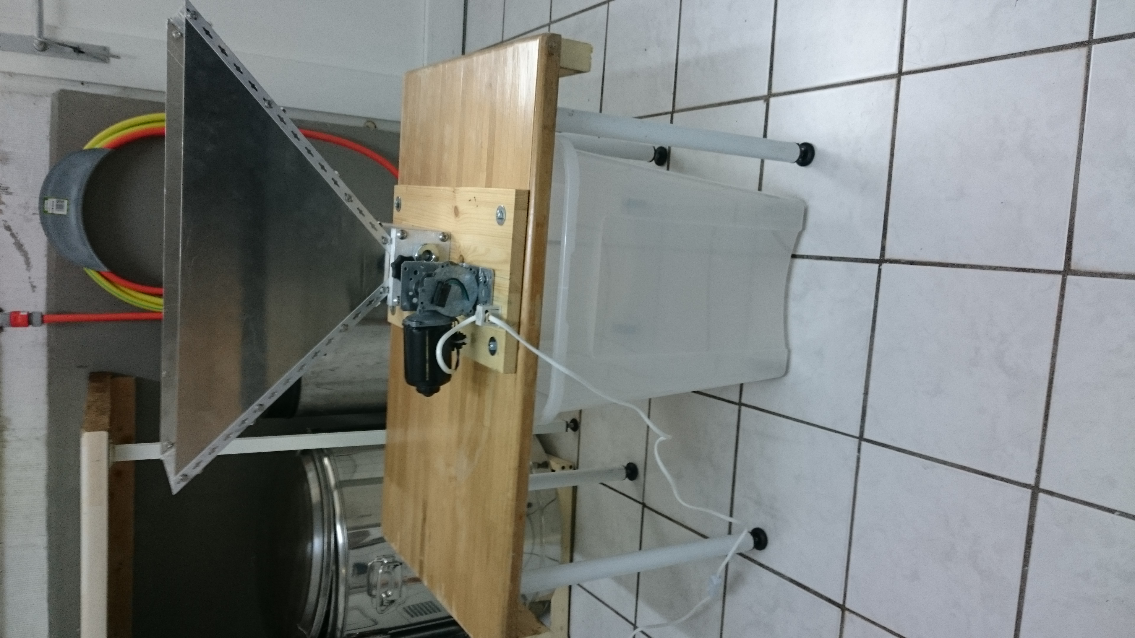 Die Mühle habe ich mit einem 12V Scheibenwischermotor vom Opel Cora ausgerüstet und bin mit dem Ergebnis zufrieden, 10 kg werden in ca 15 Min. geschrotet, den Walzenabstand habe ich mit einer Fühllehre auf 1,3 mm eingestellt. Den Trichter habe ich aus 1mm ALU-Blech und ALU-Leisten aus dem Baumarkt gefertigt. Um das Gewicht von den Walzen zu nehmen, habe ich ein kleines geschlitztes Blech in den Trichter gelegt, sodass ich den Trichter ganz füllen kann, aber das Malzgewicht auf diesem Blech liegt, Blech dient als gleichmäßiger Dosierer.