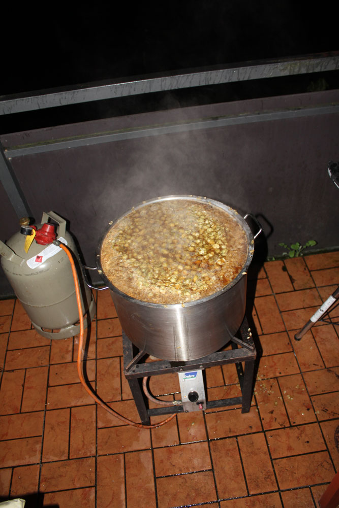 Ca. 35l der geläuterten Würze habe ich im großen Topf gekocht. Leider ging nicht mehr rein.