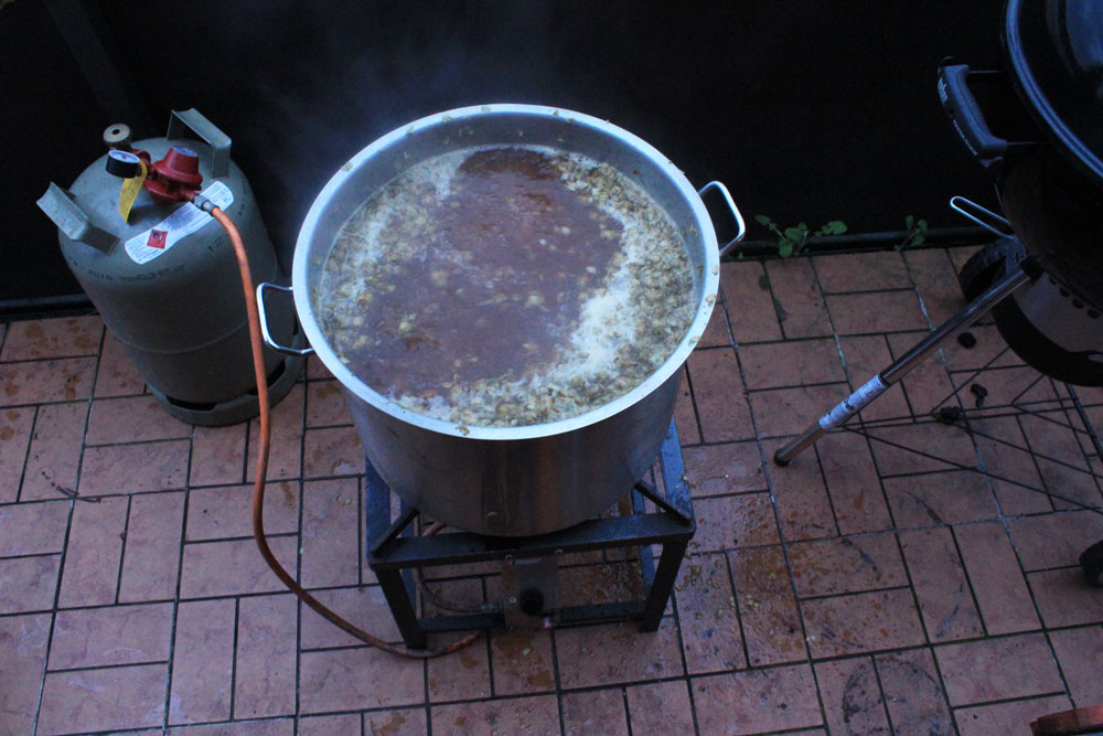 Ich nutze einen Hockerkocher und einen 40l Edelstahltopf.