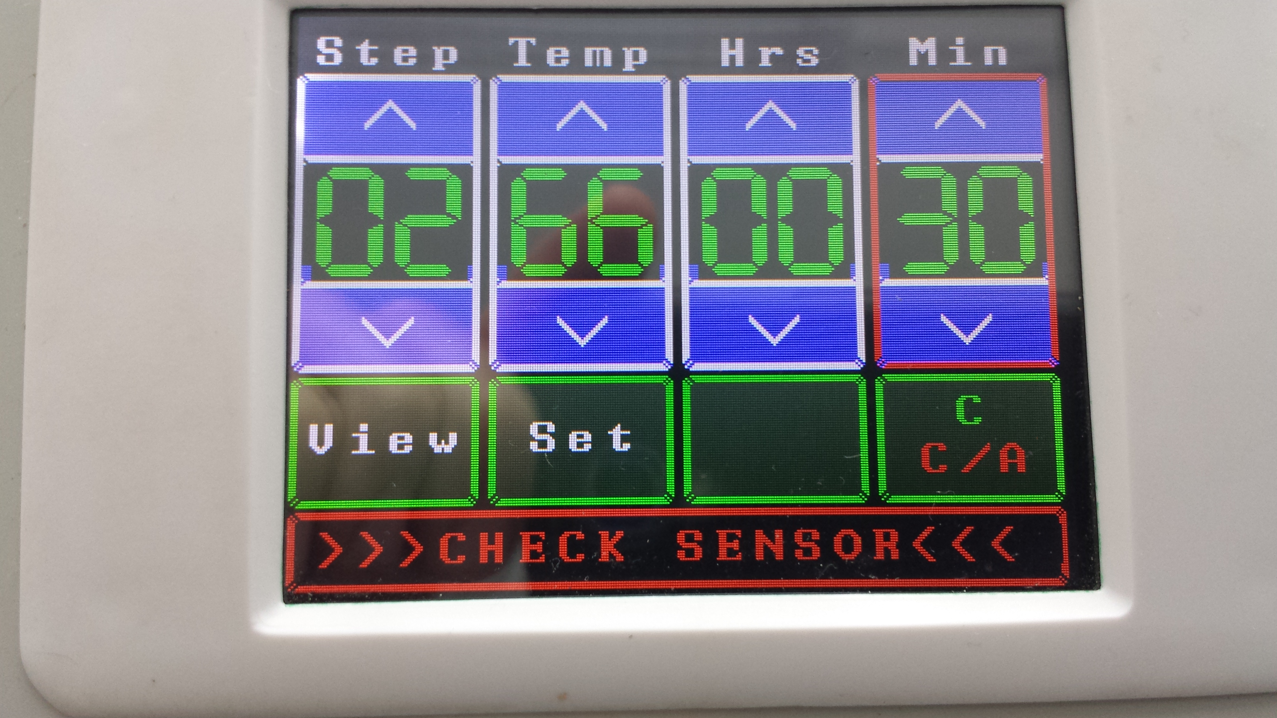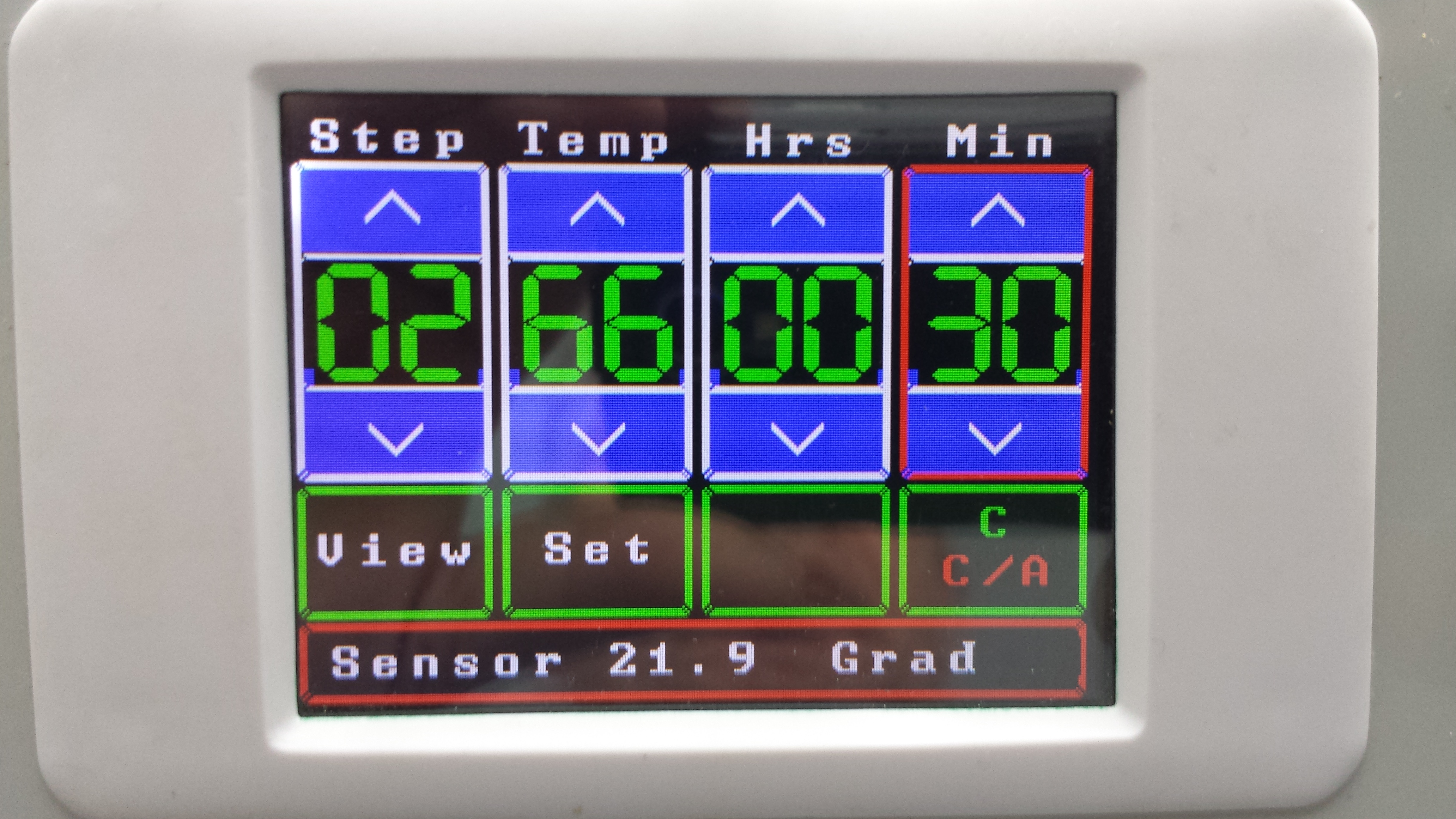 So sieht der Startbildschirm aus, sobald man die Steuerung einschaltet. Das Verstellen der Werte geht mit den Pfeiltasten relativ flott. Das Feld in dem man jeweils grade rumwurstelt hat einen roten Rahmen. Ich versuche mal, irgendwie noch ein Video zugänglich zu machen, wo man das genauer sieht, wie die Eingabe erfolgt.
