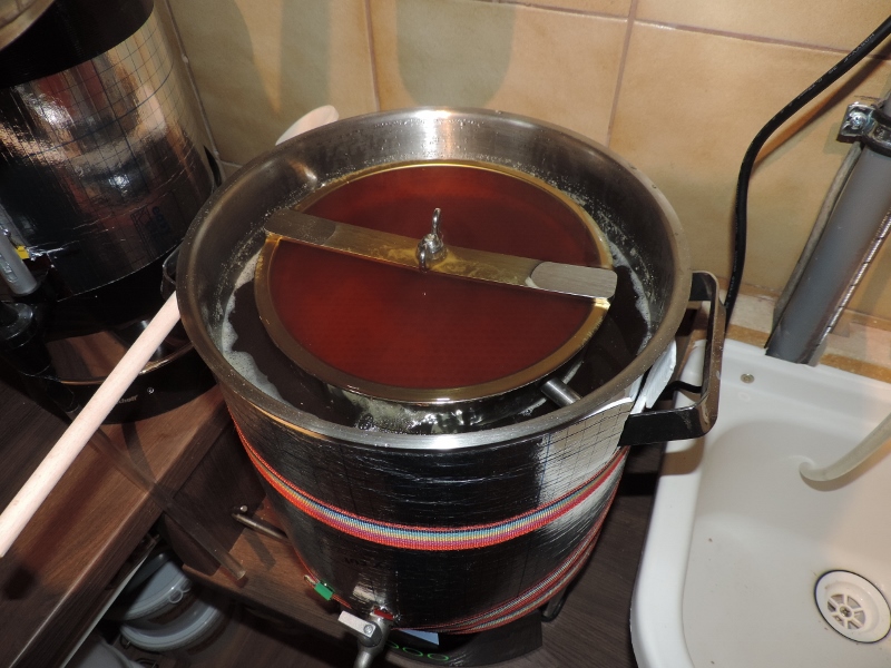 Jetzt gings an´s Läutern, das geht mit dem Braumeister super, anschwänzen mit 5,5 Liter Wasser mit 78°C, wie es sich bei der Würze-Messung herausstellte, war das zuviel.