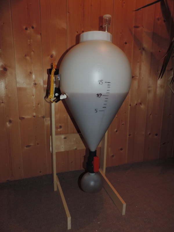 Nach dem Abkühlen, füllte ich die Würze in meinen neuen Fermenter ( Bild) jetzt kann man sagen, bei 11 Liter Würze ist das nicht nötig, aber ich möchte ein klareres Bier und der Fermenter ist für mich das beste Gerät dazu.