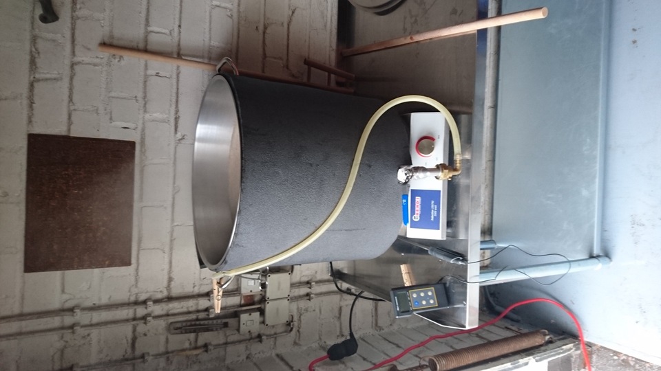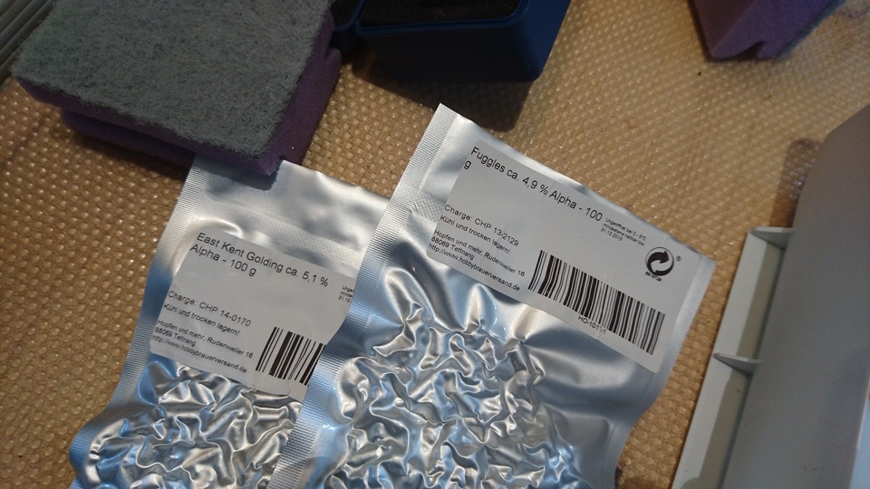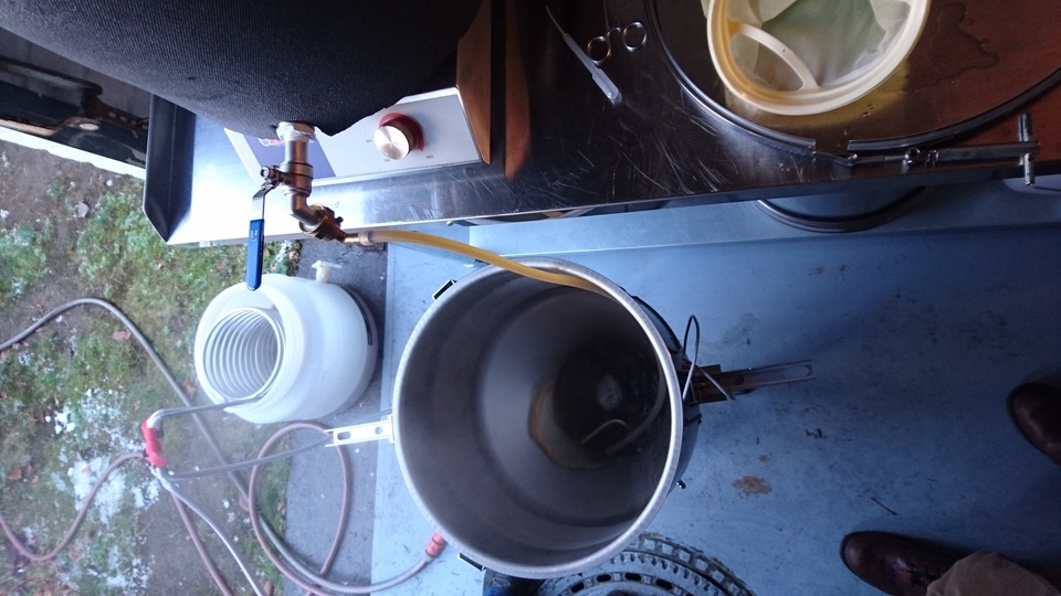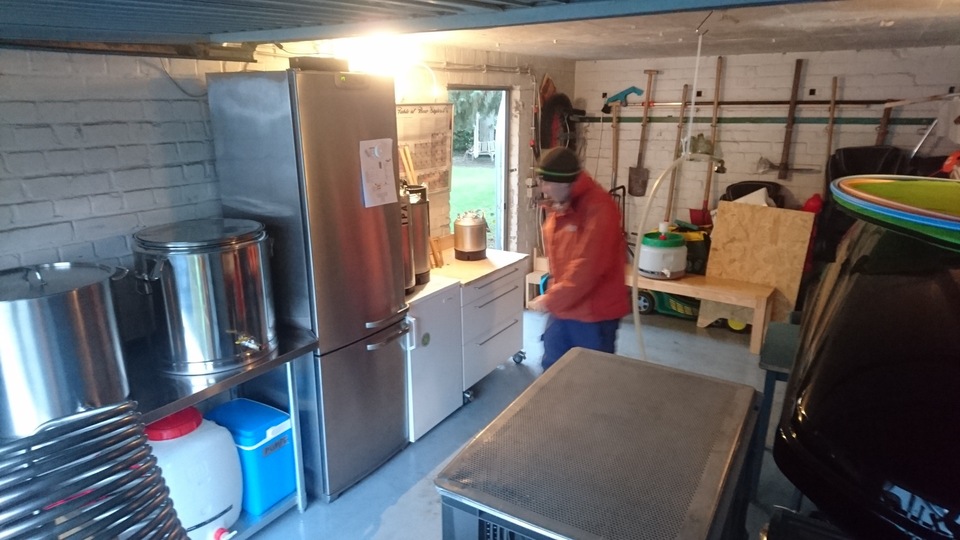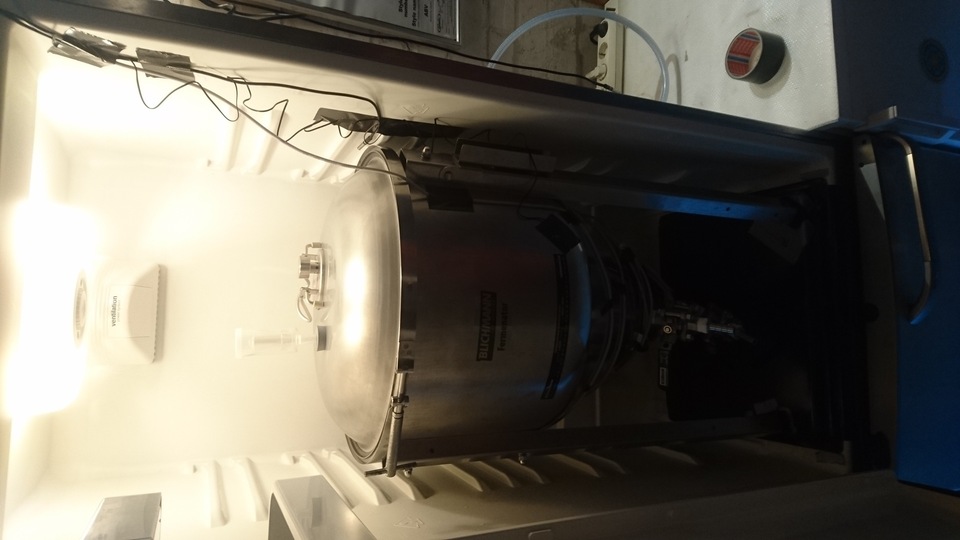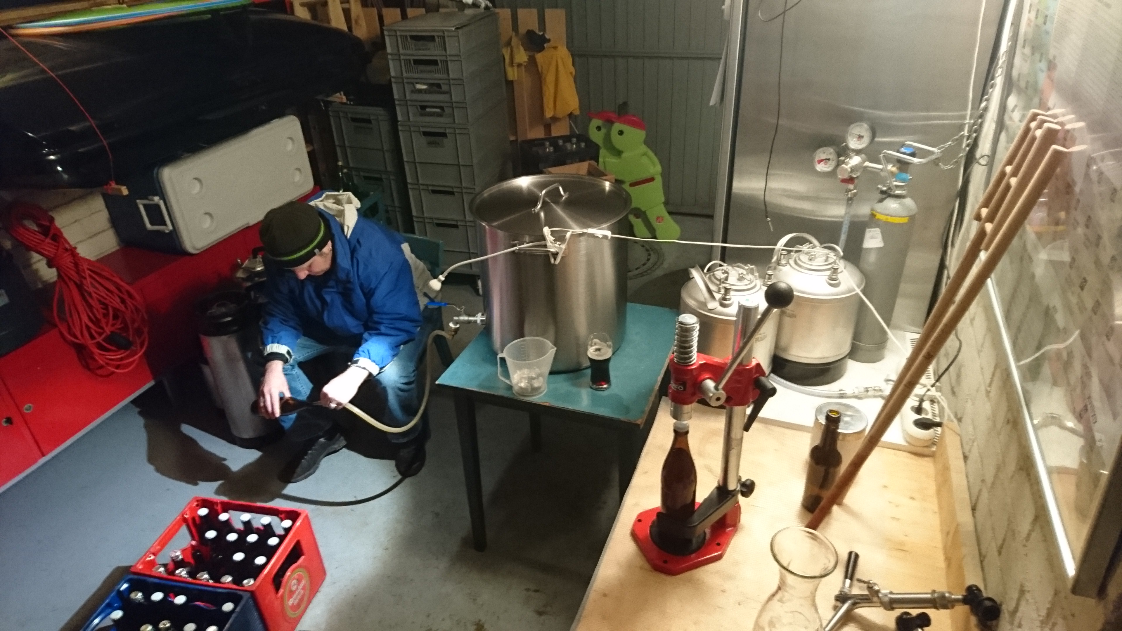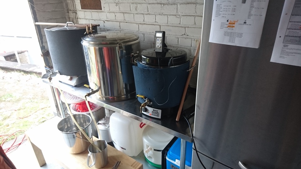 Gemütlicher Brautag, auf geht es ! Erstmal Tass Kaff. Heute mal echt faul und mit elektrischer Unterstützung. "Strike Water Temp" erreicht. Kann losgehen. Feuer frei! Während der Rast: Aufräumen. Hier rastet es single step. Läutern vorbereitet. Läutern. Nachgüsse. Vorderwürze. Aus der Kühlung in die Pfanne. Kurz mal nicht aufgepasst ... (Kleine Panne am Rande) Treber, scheinbar hat da jemand schon genascht. 100°C EKG Temperaturfühler im Kühlschrank. Der musste erstmal "richtig" sauber. Hier kocht es. Gute Stube. Fuggles. UT200 / raspberry pee/ Gaermonitor vorbereiten. Heizdraht Terrarium. plus Irisch Moos. not. 11°Brix. Knapp 11°P. Reicht. Ssn da los? Ah, deswegen! Klar! Test White-IPA. Skaal! Draht am Tank - hat was von Weihnachtsbaum schücken. Ab gehts. Spitze des Eisbergs. Ging schnell bei Aussentemperatur von 3°C (+/-). London Ale. Zeug gegeben. Kabel dran. Ducktape ole! Fast fertig! Tadah!
