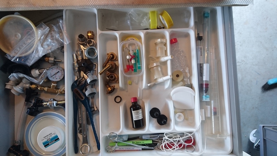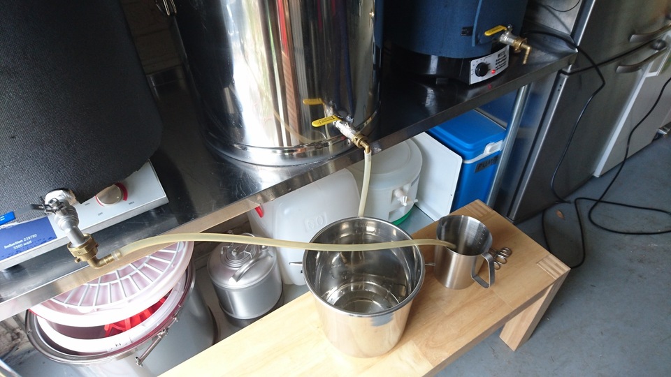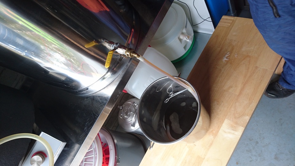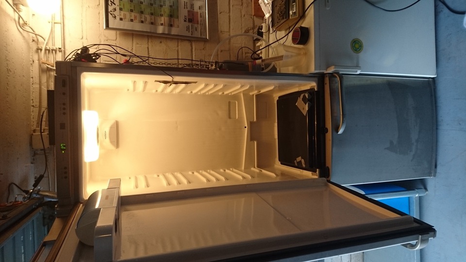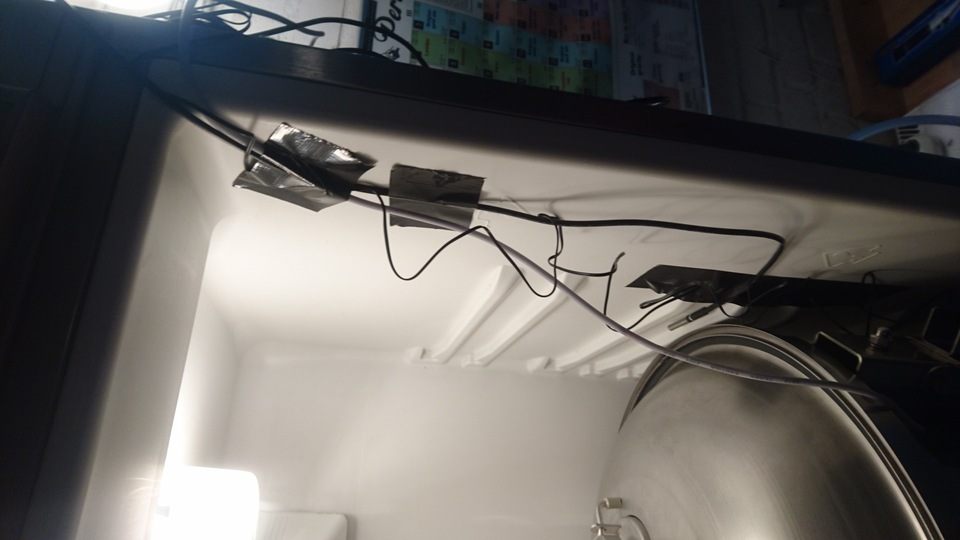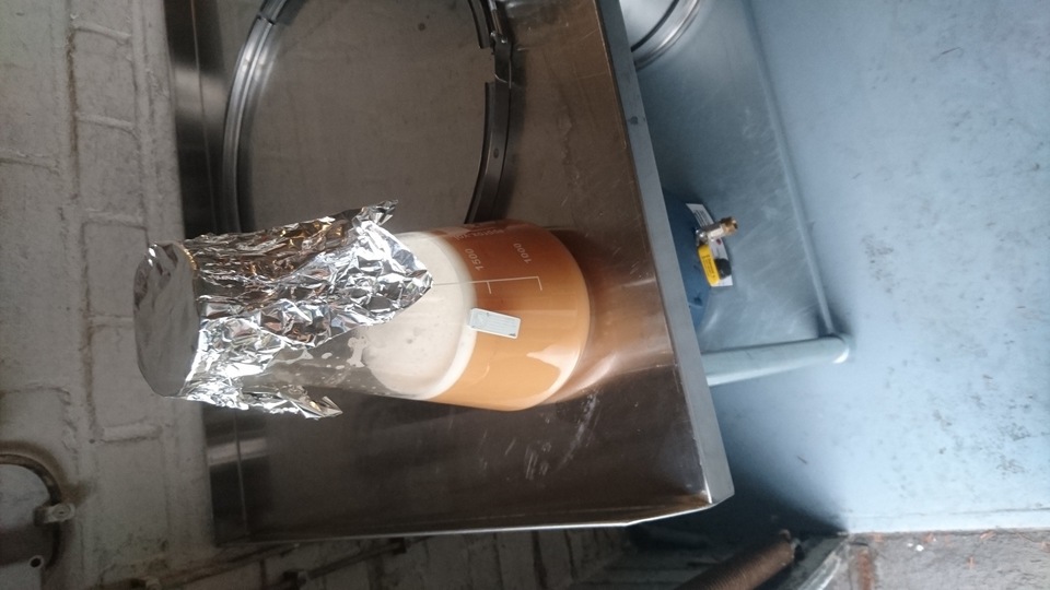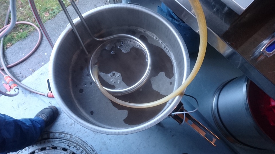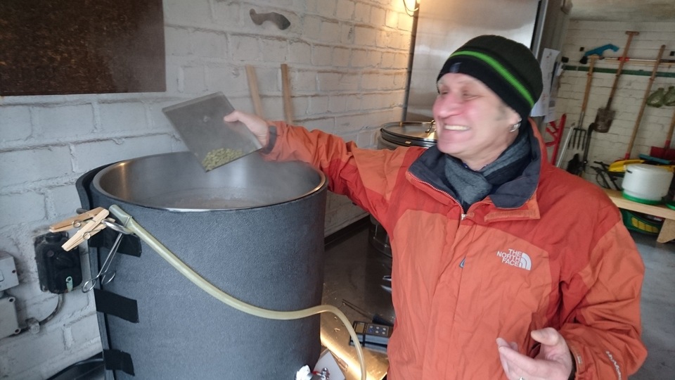 Gemütlicher Brautag, auf geht es ! Erstmal Tass Kaff. Heute mal echt faul und mit elektrischer Unterstützung. "Strike Water Temp" erreicht. Kann losgehen. Feuer frei! Während der Rast: Aufräumen. Hier rastet es single step. Läutern vorbereitet. Läutern. Nachgüsse. Vorderwürze. Aus der Kühlung in die Pfanne. Kurz mal nicht aufgepasst ... (Kleine Panne am Rande) Treber, scheinbar hat da jemand schon genascht. 100°C EKG Temperaturfühler im Kühlschrank. Der musste erstmal "richtig" sauber. Hier kocht es. Gute Stube. Fuggles. UT200 / raspberry pee/ Gaermonitor vorbereiten. Heizdraht Terrarium. plus Irisch Moos. not. 11°Brix. Knapp 11°P. Reicht. Ssn da los? Ah, deswegen! Klar! Test White-IPA. Skaal! Draht am Tank - hat was von Weihnachtsbaum schücken. Ab gehts. Spitze des Eisbergs. Ging schnell bei Aussentemperatur von 3°C (+/-). London Ale. Zeug gegeben. Kabel dran. Ducktape ole! Fast fertig! Tadah!