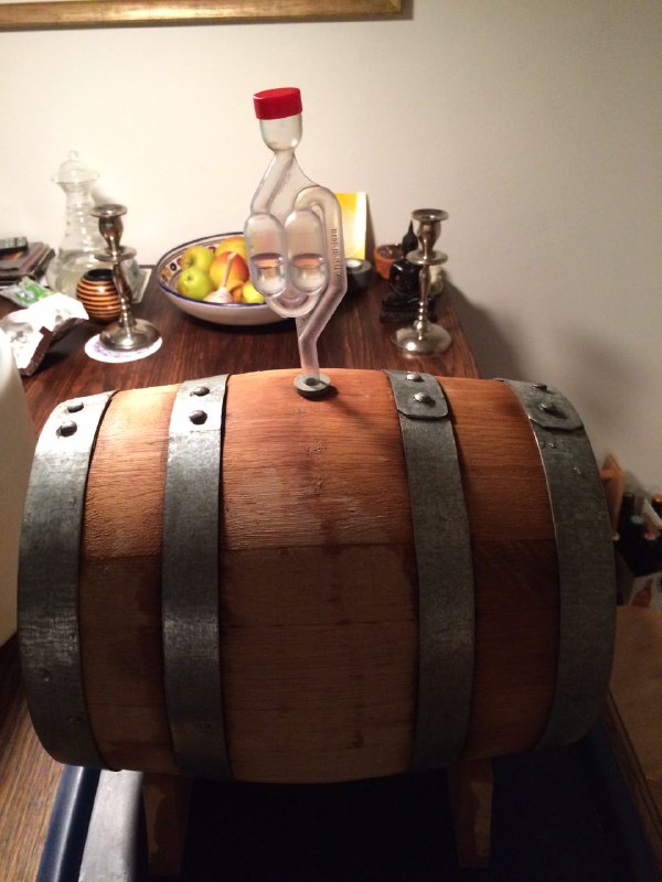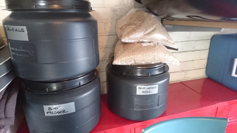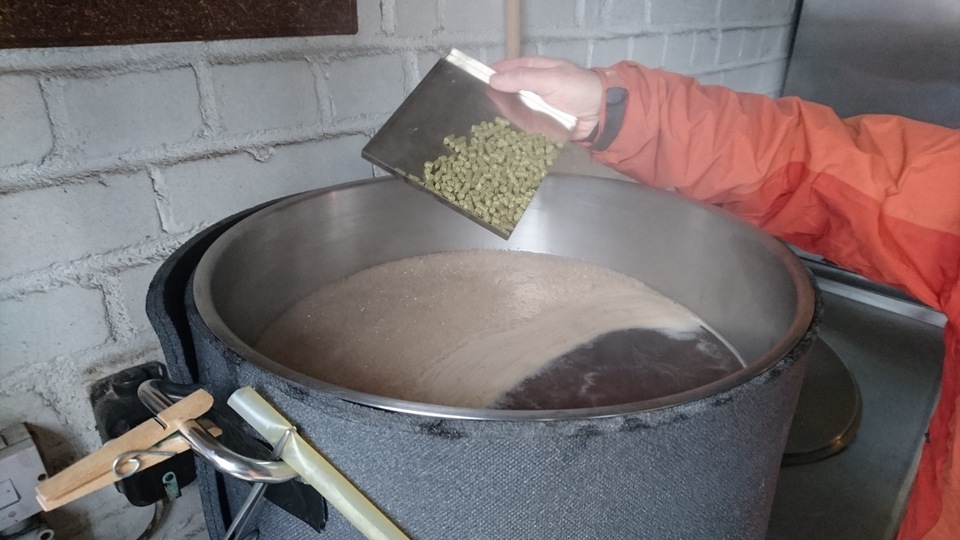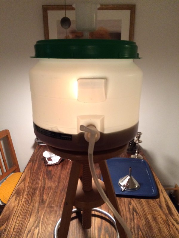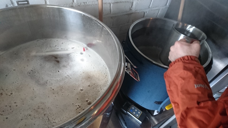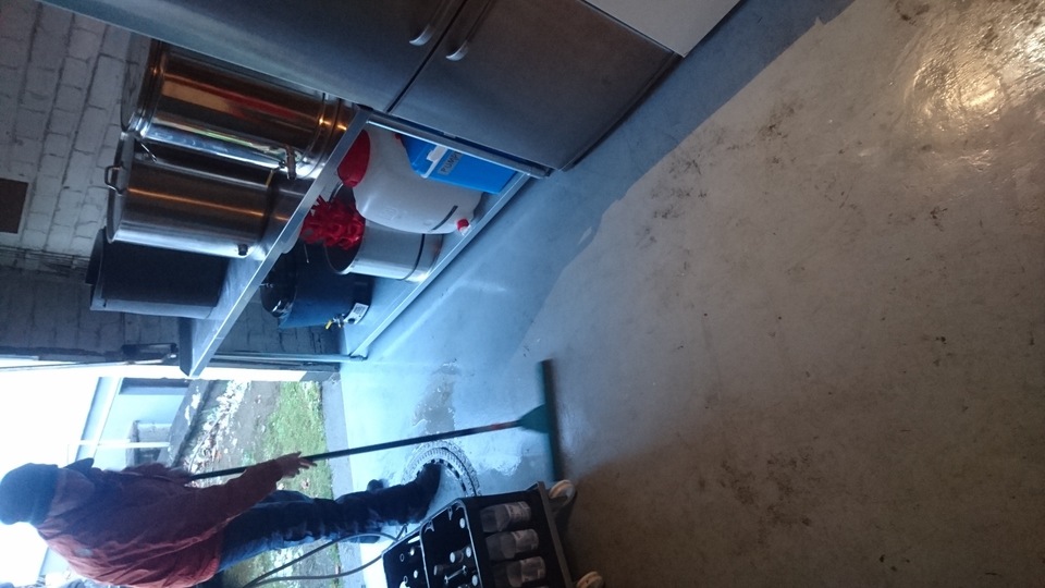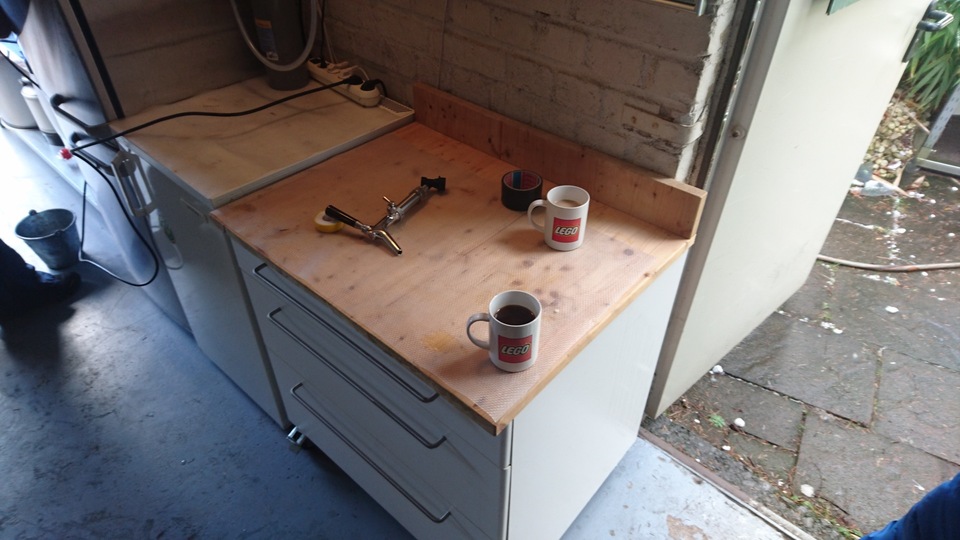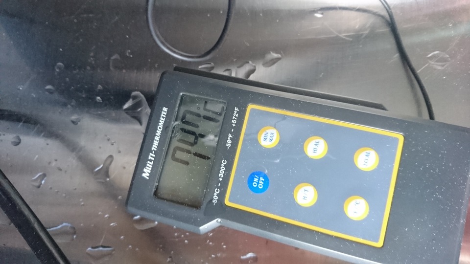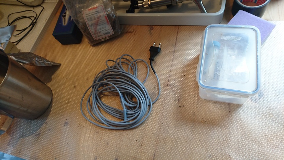 Gemütlicher Brautag, auf geht es ! Erstmal Tass Kaff. Heute mal echt faul und mit elektrischer Unterstützung. "Strike Water Temp" erreicht. Kann losgehen. Feuer frei! Während der Rast: Aufräumen. Hier rastet es single step. Läutern vorbereitet. Läutern. Nachgüsse. Vorderwürze. Aus der Kühlung in die Pfanne. Kurz mal nicht aufgepasst ... (Kleine Panne am Rande) Treber, scheinbar hat da jemand schon genascht. 100°C EKG Temperaturfühler im Kühlschrank. Der musste erstmal "richtig" sauber. Hier kocht es. Gute Stube. Fuggles. UT200 / raspberry pee/ Gaermonitor vorbereiten. Heizdraht Terrarium. plus Irisch Moos. not. 11°Brix. Knapp 11°P. Reicht. Ssn da los? Ah, deswegen! Klar! Test White-IPA. Skaal! Draht am Tank - hat was von Weihnachtsbaum schücken. Ab gehts. Spitze des Eisbergs. Ging schnell bei Aussentemperatur von 3°C (+/-). London Ale. Zeug gegeben. Kabel dran. Ducktape ole! Fast fertig! Tadah!