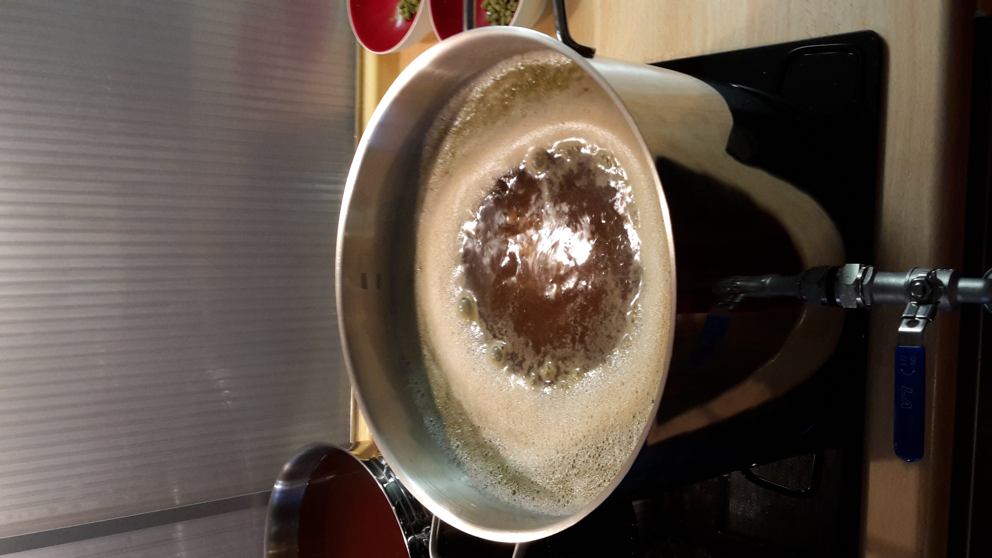 Wallendes Kochen, dank 1,5KW Tauchsieder innerhalb weniger Minuten. hinten die ca. 4l mit 2°P zum Verdunstung ausgleichen