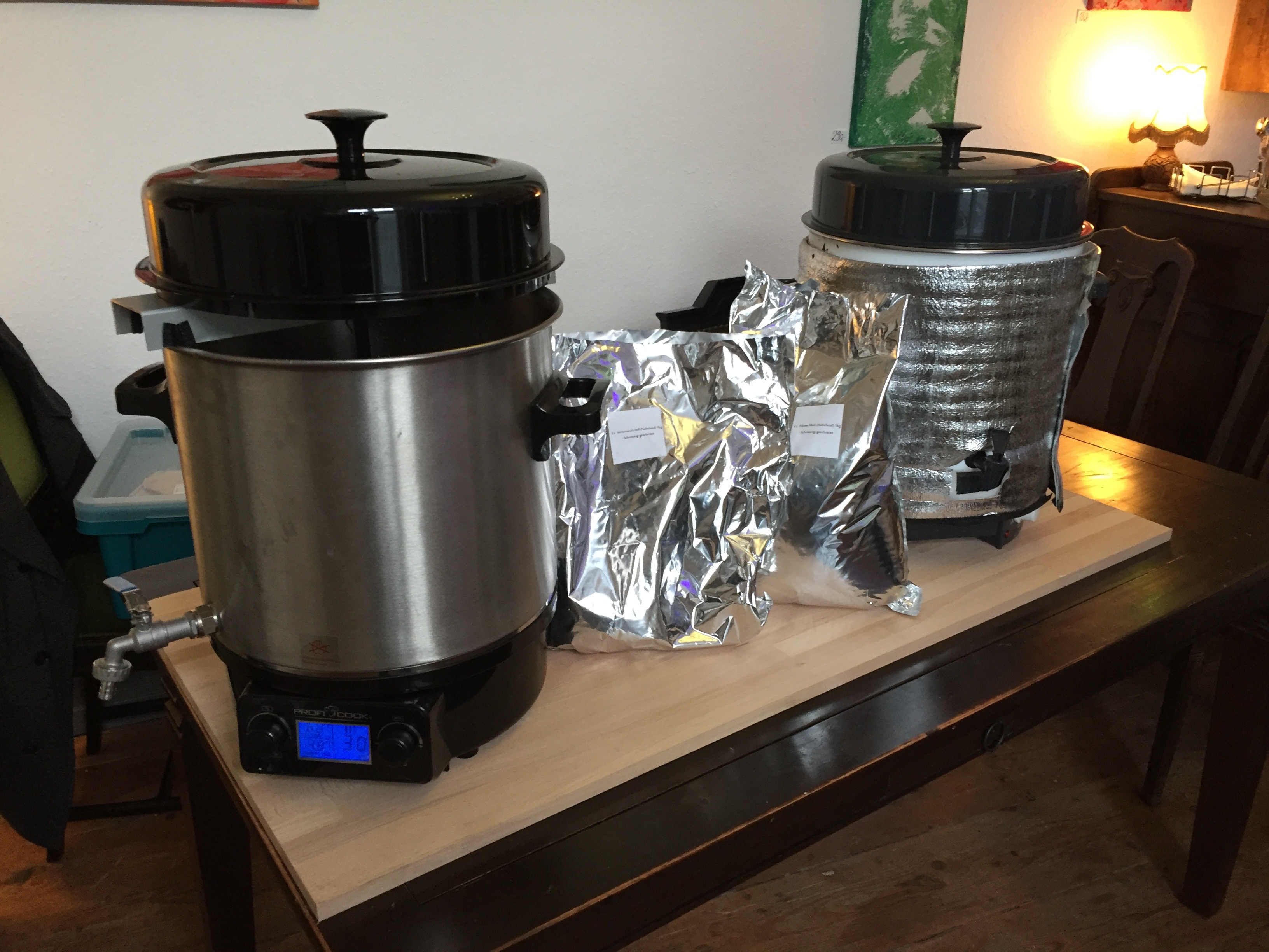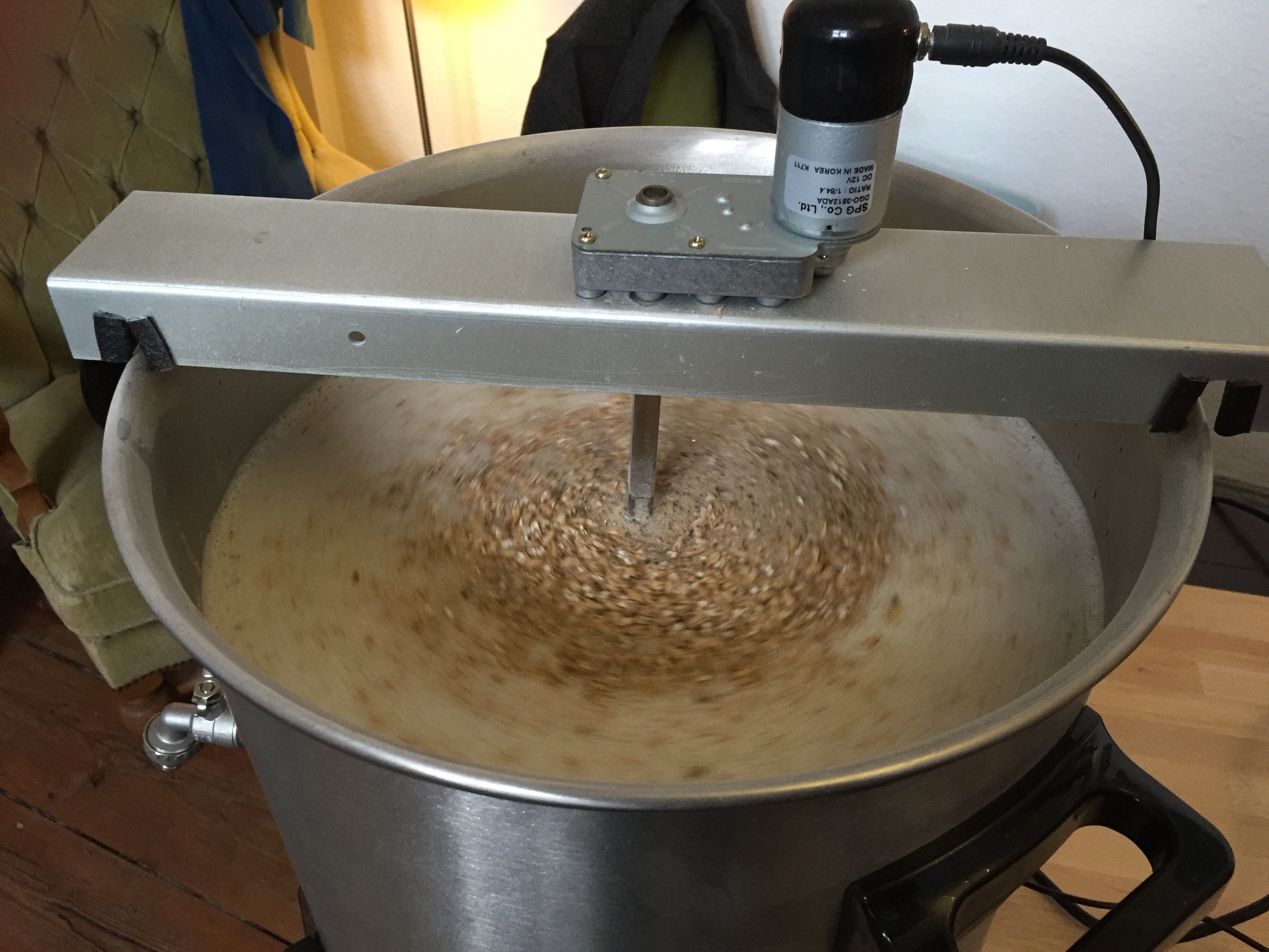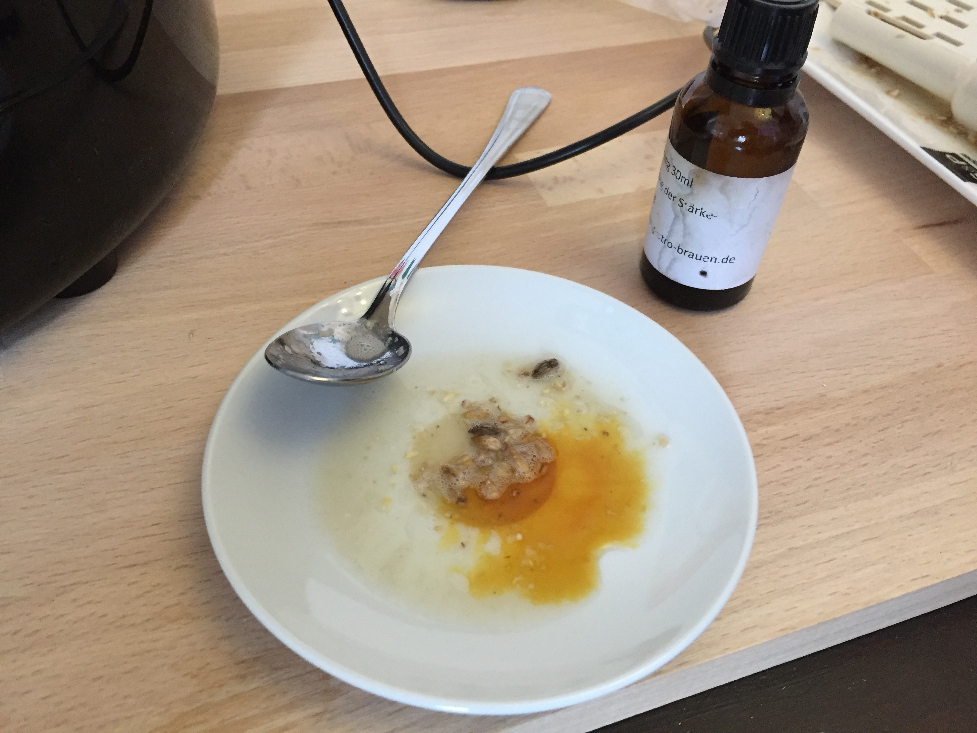 Es geht los Das Rührwerk leistet gute Arbeit ...der Proficool leider nicht(er zeigt die Temperatur oftmals falsch an-ein Krampf!) Jodprobe okay Lasst uns läutern Bis es klar ist Hopfenkochen(Vorderwürzehopfung und in den Whirlpool) Trubkegel Ab in den Gäreimer